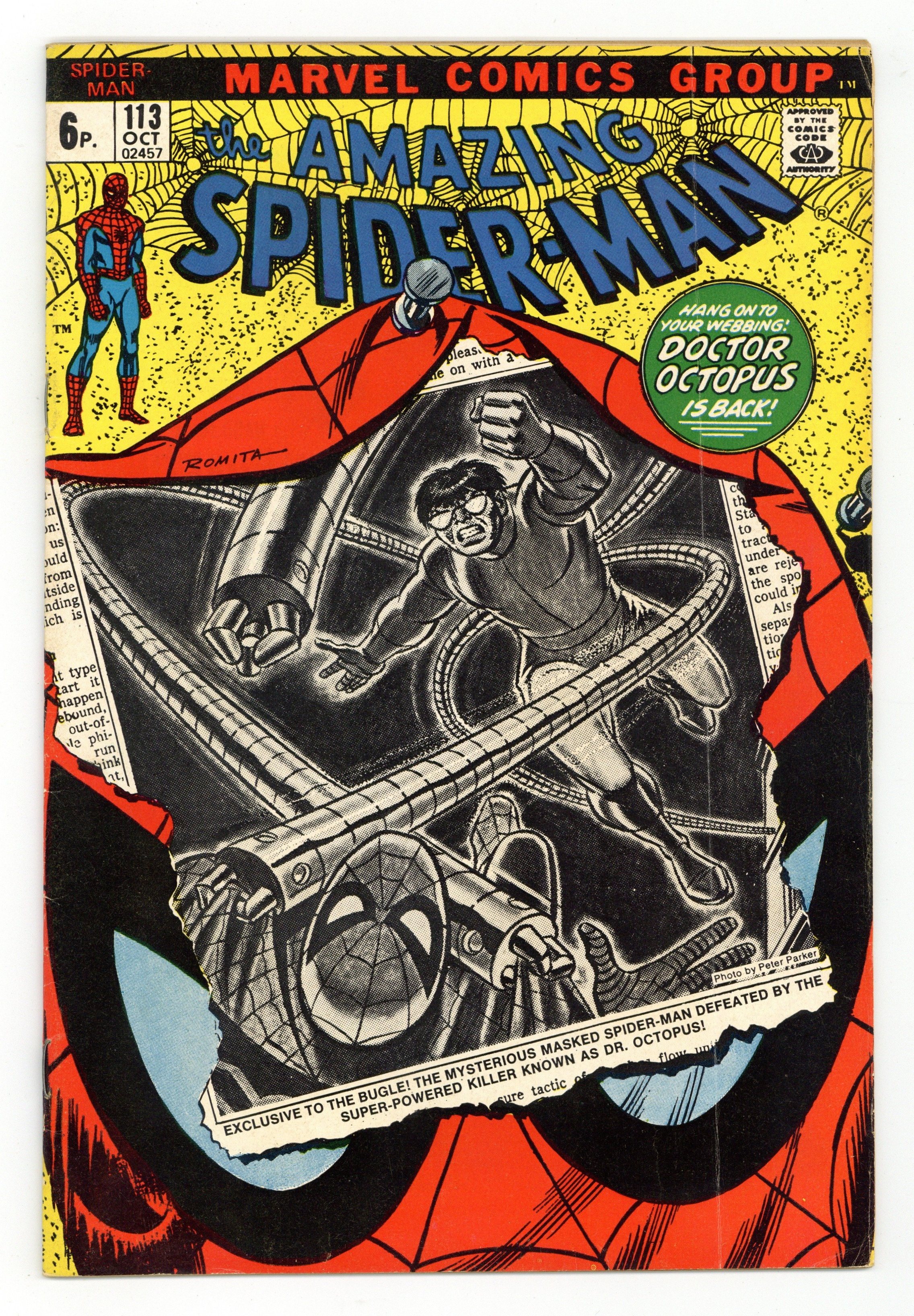 UK edition. Identical to US edition, but has 6p cover price. Cover art by John Romita. First appearance of Hammerhead in They Call The Doctor...Octopus!, script by Gerry Conway, pencils by John Romita and Jim Starlin, inks by John Romita and Tony Mortellaro; While Dr. Octopus is on a crime spree, Spider-Man is weakened by an ulcer due to stress and his concern for his missing aunt. Reprinted in Marvel Tales # 92. 32 pgs.