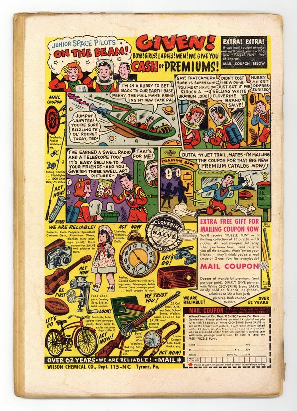 Starts Jan 3 Cover by Sheldon Moldoff. "The Challenge of Batwoman," script by Bill Finger, pencils by Sheldon Moldoff (as Bob Kane), inks by Charles Paris; Batwoman believes that an amnesiac man she finds is really Batman and that she should re-train him in crime fighting methods; Since Batman is injured and must stay out of action, he and Robin go along with her mistake, but the man is really the leader of a gang of crooks. Half-page Casey the Cop story by Henry Boltinoff. Winter Sports Champions of the World public service announcement, script by Jack Schiff, art by Ruben Moreira. "The Second Boy Wonder!", script by France Herron, pencils by Sheldon Moldoff (as Bob Kane), inks by Charles Paris; After battling Gorilla Hardy and his gang, the Dynamic Duo arrive back at the Bat-Cave, but Robin has a surprise for his caped counterpart: he is NOT Dick Grayson, but Fred Loyd, who assumed the role after Dick Grayson was injured. "Gems in a Jam" text story. "The Mysterious Bat-Missile," pencils by Sheldon Moldoff (as Bob Kane), inks by Charles Paris; A strange vehicle materializes in the Bat-Cave which helps Batman and Robin in their crime fighting duties, but they are wary of its unknown origin. 2/3-page Casey the Cop story by Henry Boltinoff. 36 Pages, Full Color. Cover price $0.10.