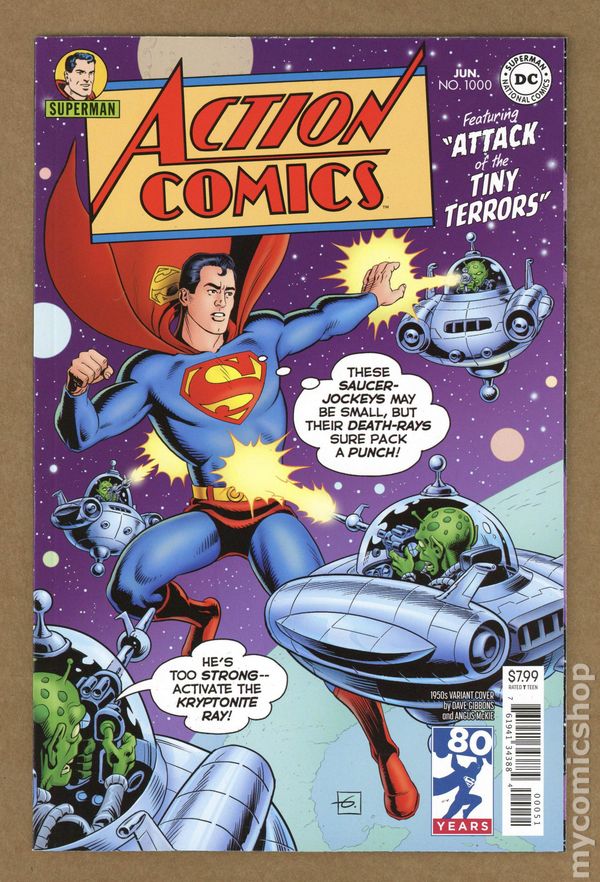 Tags: Superman$2.50Cover by Dave Gibbons. Written by Dan Jurgens, Peter J. Tomasi, Marv Wolfman, Geoff Johns, Richard Donner, Scott Snyder, Tom King, Louise Simonson, Paul Dini, Brad Meltzer and Brian Michael Bendis. Art by Dan Jurgens, Norm Rapmund, Patrick Gleason, Curt Swan, Butch Guice, Kurt Schaffenberger, Olivier Coipel, Rafael Albuquerque, Clay Mann, Jerry Ordway, José Luis García-López, Kevin Nowlan, John Cassaday, Jim Lee and Scott Williams. Celebrate 1000 issues of Action Comics with an all-star lineup of top talent as they pay tribute to the comic that started it all! From today's explosive action to a previously unpublished tale illustrated by the legendary Curt Swan to the Man of Tomorrow's future, this very special, oversized issue presents the best of the best in Superman stories! Featuring: "From the City That Has Everything" by Dan Jurgens and Norm Rapmund; "Never-Ending Battle" by Peter J. Tomasi and Patrick Gleason; "An Enemy Within" by Marv Wolfman, Curt Swan, Butch Guice and Kurt Schaffenberger (note: original story by Cindy Goff, Swan and Guice, with the final page courtesy of Superman The Secret Years (1985) #2 by Bob Rozakis, Swan and Schaffenberger); "The Car" by Geoff Johns, Richard Donner and Olivier Coipel; "The Fifth Season" by Scott Snyder and Rafael Albuquerque; "Of Tomorrow" by Tom King and Clay Mann; "Five Minutes" by Louise Simonson and Jerry Ordway; "Actionland!" by Paul Dini, José Luis García-López and Kevin Nowlan; "Faster Than a Speeding Bullet" by Brad Meltzer and John Cassaday; and "The Truth" by Brian Michael Bendis, Jim Lee and Scott Williams. Plus: Pin-ups by John Romita, Jr. and Danny Miki, Walter Simonson, and Jorge Jimenez. Softcover, 80 pages, full color. Rated T Cover price $7.99.
