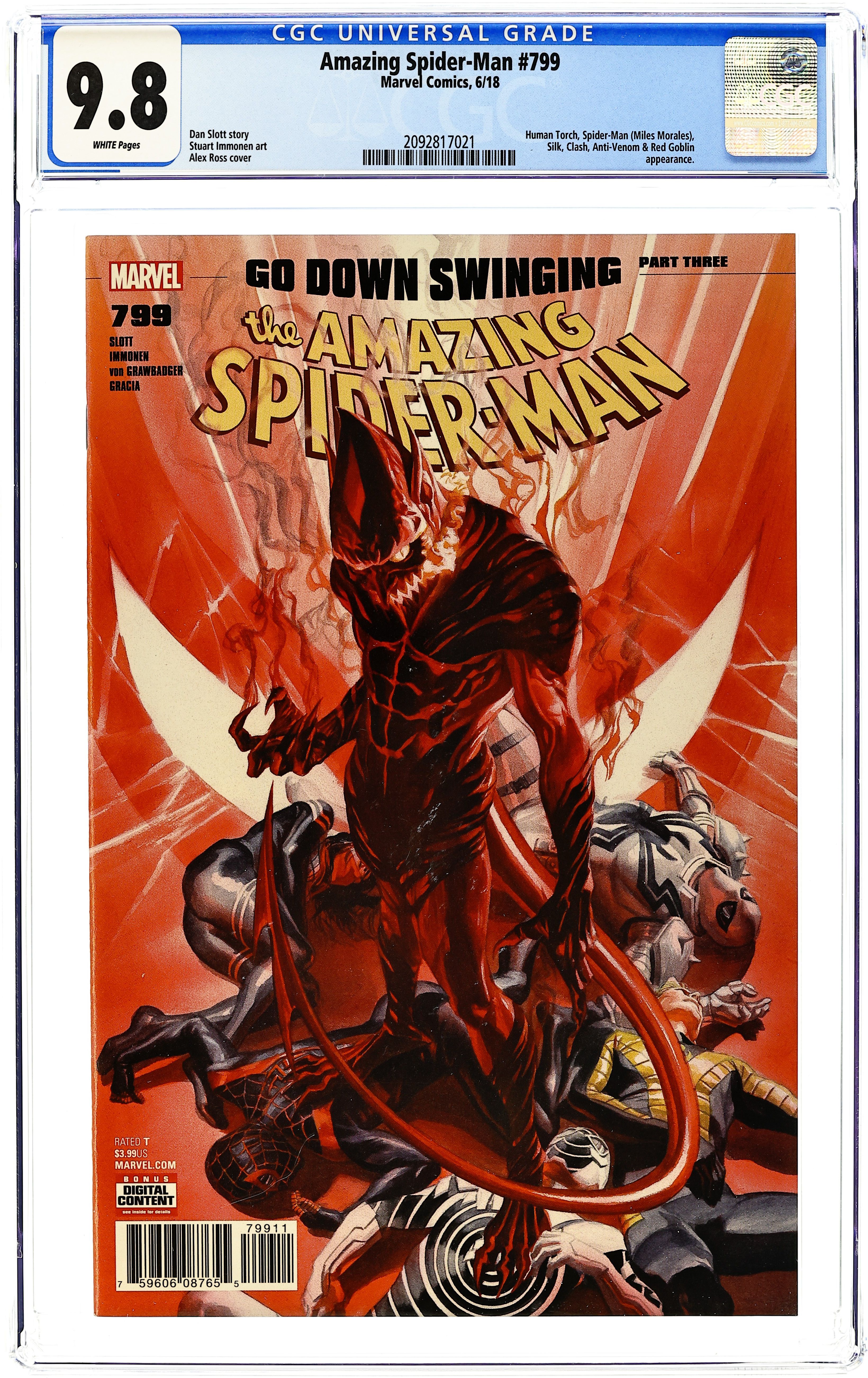Go Down Swinging: Part 3 of 4 - Written by Dan Slott. Art by Stuart Immonen. Cover by Alex Ross. SPIDER-MAN will need to the help of friend and foe alike if he hopes to stop THE GREEN GOBLIN this time! The mystery of the RED GOBLIN is finally revealed, and it's not going to be pretty for Peter Parker! 28 pages, full color. Rated T Cover price $3.99.