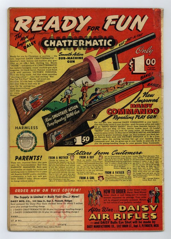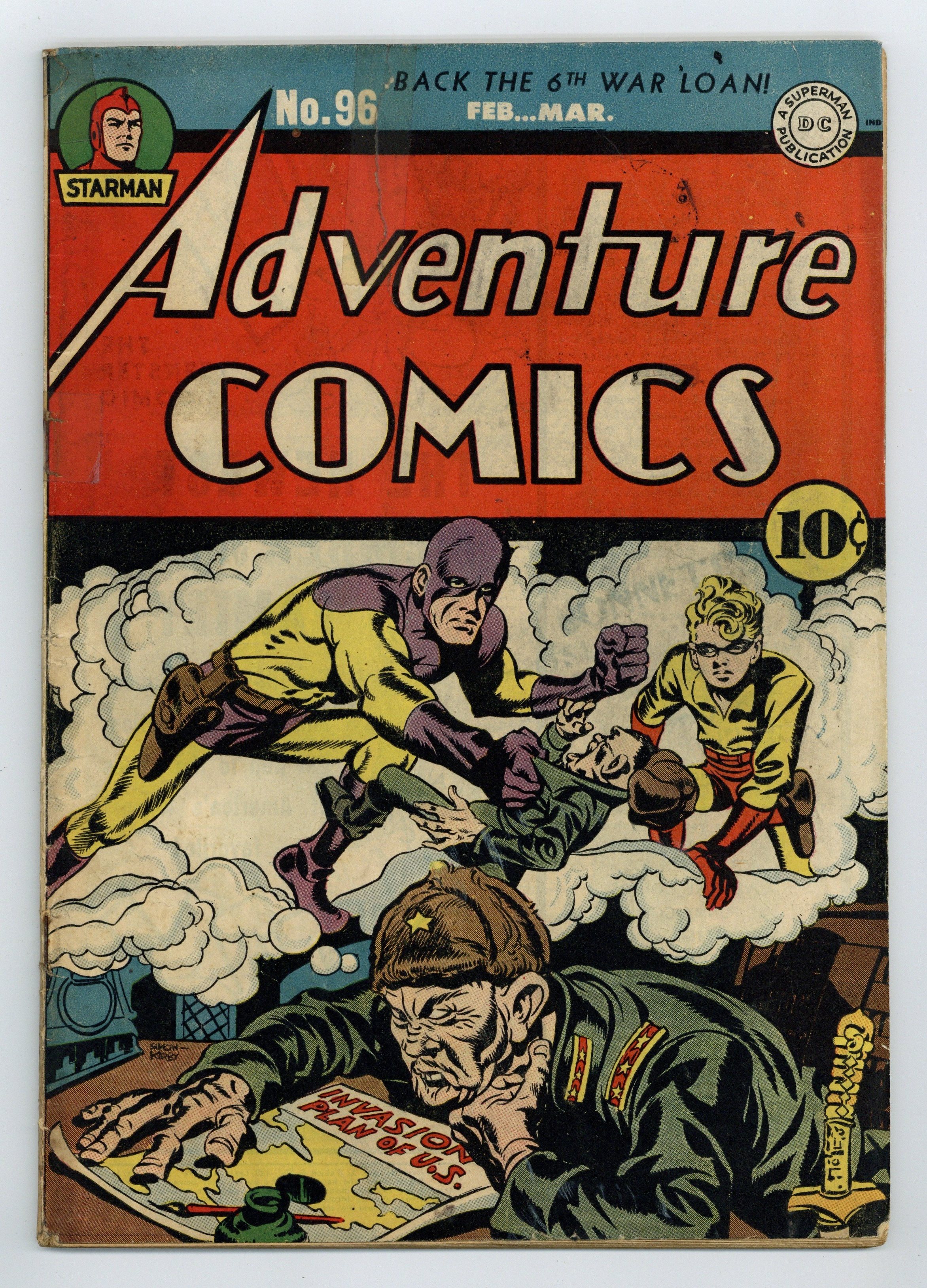 $400.00Cover pencils by Jack Kirby, inks by Joe Simon. Two Dreams to Destiny starring The Sandman, script by Joe Samachson, art by Pen Shumaker; High-Hat Archie overhears Philo relating a dream of his to Wes and Sandy, a dream in which Archie and his gang steal the cash from Jone's estate, escape, and then are tracked down by the Sandman and Sandy. Of Rogues and Rabbits starring The Shining Knight, script by Joe Samachson, art by Louis Cazeneuve. Melody in Treble Trouble starring Genius Jones, script by Whitney Ellsworth, art by Stan Kaye. Prediction For Plunder starring Starman, script by Joe Samachson, art by Emil Gershwin. Idol Victory starring Mike Gibbs, Guerilla, script by Joe Samachson, art by Maurice Del Bourgo. The back cover contains a third-page Tootsie Roll ad, "Capt. Tootsie and the Toy Cannon. 52 pages, Full Color. Cover price $0.10.