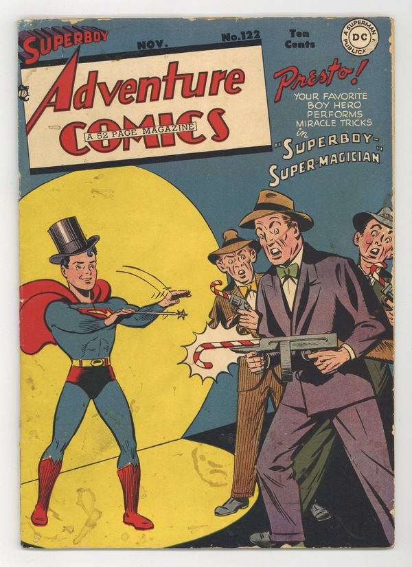 Cover pencils by Al Wenzel, inks by George Roussos. Superboy -- Super-Magician, script by Bill Finger, art by Al Wenzel; After Superboy arrests the magician hired for a neighborhood party, he has to replace him, without using his super powers. The Crooked Fireman starring Shining Knight, script by Joe Samachson, art by Chuck Winter. King of Danger Channel starring Green Arrow, script by George Kashdan, art by George Papp. Operation Justice starring Aquaman, art by John Daly. The Speed Collector starring Johnny Quick, pencils by Mort Meskin, inks by George Roussos. 52 pages, Full Color. Cover price $0.10.