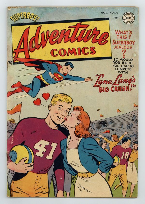 Cover art by Win Mortimer. Lana Lang's Big Crush, script by William Woolfolk, art by John Sikela; Superboy gets jealous. Mutiny Under the Sea starring Aquaman, script by George Kashdan, art by Ramona Fradon. The Bravest Cowards in the World starring Johnny Quick, script by Jack Miller, art by Ralph Mayo. Green Arrow, Fugitive, art by George Papp. Superman stars in a one-page public service announcement, "The World Is Out Schoolroom!". 44 pages, Full Color. Cover price $0.10.