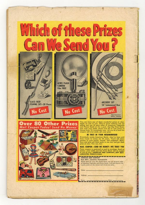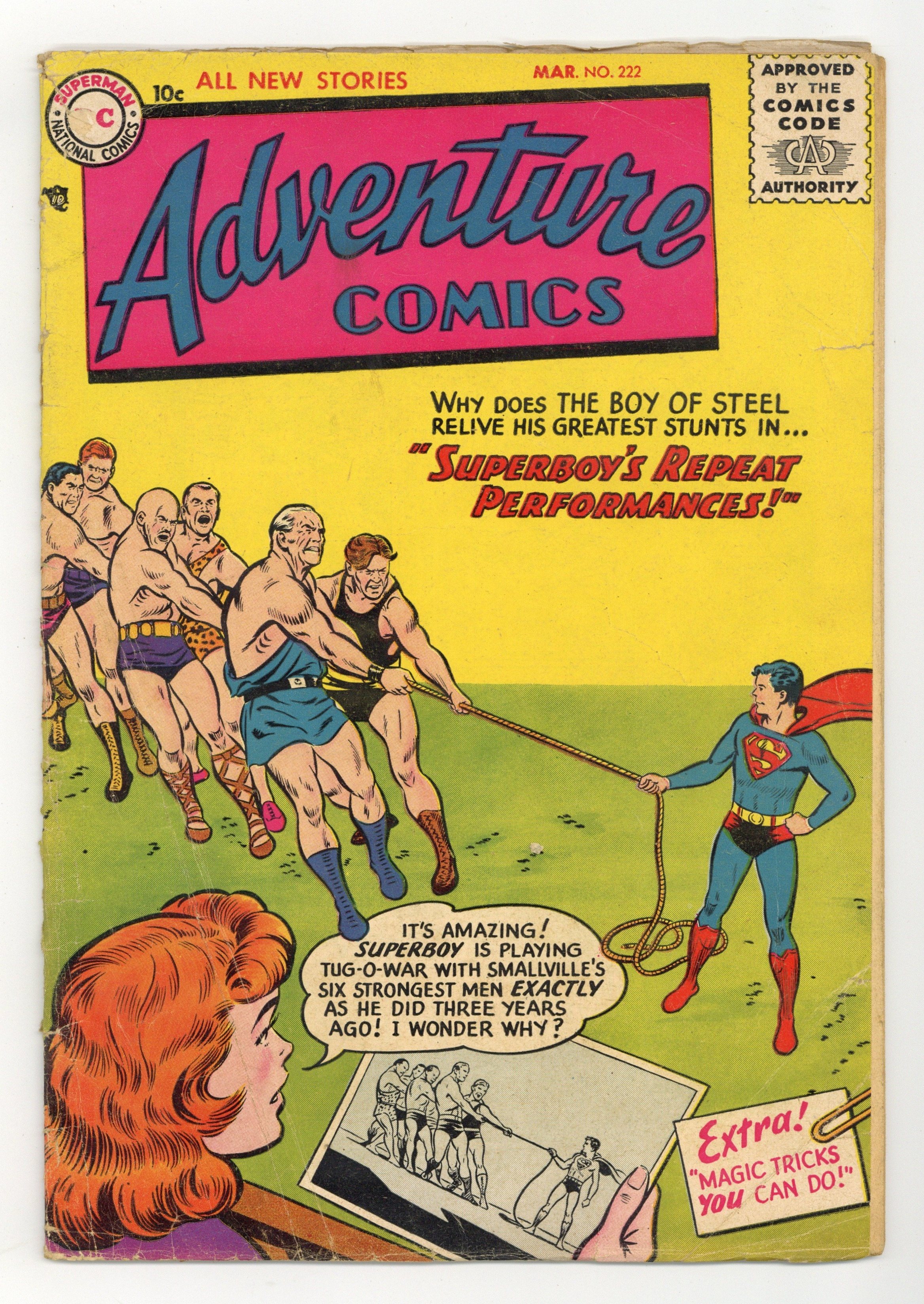 Cover pencils by Curt Swan, inks by Stan Kaye. Superboy's Repeat Performance, script by Otto Binder, art by John Sikela; Superboy is compelled to repeat past super deeds after an encounter with a kryptonite meteor. Little Pete humor page by Henry Boltinoff. A Rival For Aquaman, art by Ramona Fradon; Aquaman meets a mysterious character who can swim at super speed. Varsity Vic humor page by Henry Boltinoff. Magic Tricks You Can Do article. The Cowboy Archers starring Green Arrow, art by George Papp. 36 pages, Full Color. Cover price $0.10.