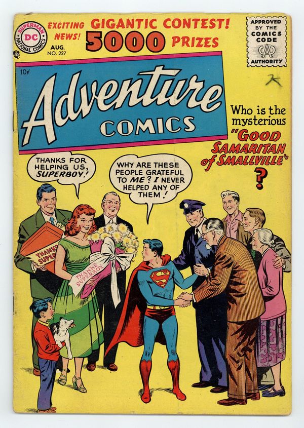 Cover pencils by Curt Swan, inks by Stan Kaye. The Good Samaritan of Smallville, script by Otto Binder, pencils by Curt Swan, inks by George Klein; Somebody in Smallville is helping people and Superboy is getting the credit for it. A Day in the Life of Aquaman, art by Ramona Fradon; People In the News wants to do a show about Aquaman. Varsity Vic humor page by Henry Boltinoff. The Green Arrow Mystery Cards, art by George Papp. 36 pages, Full Color. Cover price $0.10.