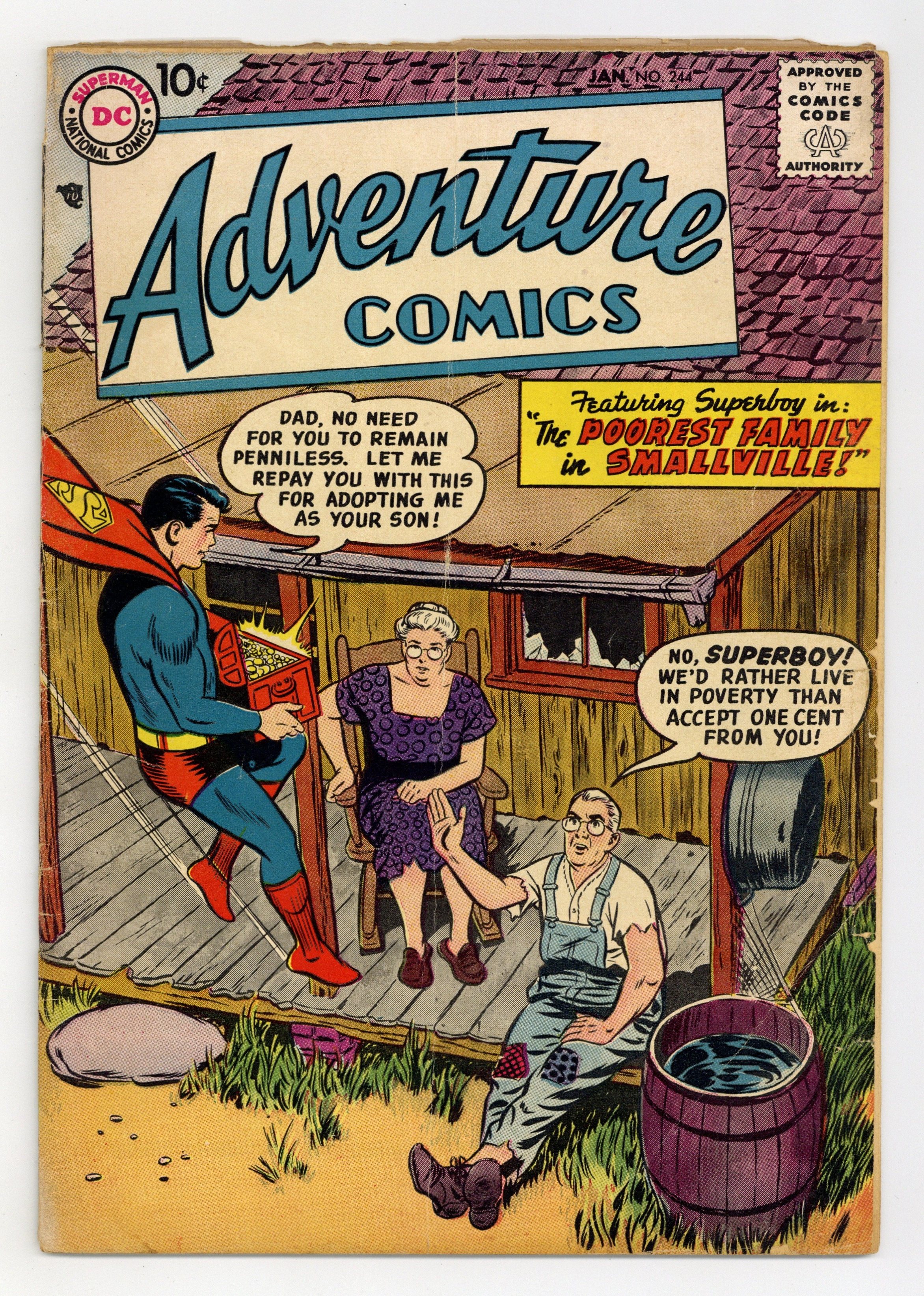 Cover pencils by Curt Swan, inks by Stan Kaye. The Poorest Family in Smallville starring Superboy, script by Alvin Schwartz, art by John Sikela; Ma and Pa Kent are poverty stricken. Ad for Sgt. Bilko, Bob Hope, Jerry Lewis, and Jackie Gleason. Little Pete humor page by Henry Boltinoff. Mysteries in Space fact page by Mort Drucker. A Medal for Roy starring Green Arrow, script by George Kashdan, art by George Papp. Jerry Jitterbug humor page by Henry Boltinoff. The Copy Cat Creature starring Aquaman, script by Robert Bernstein, art by Ramona Fradon. 36 pages, Full Color. Cover price $0.10.