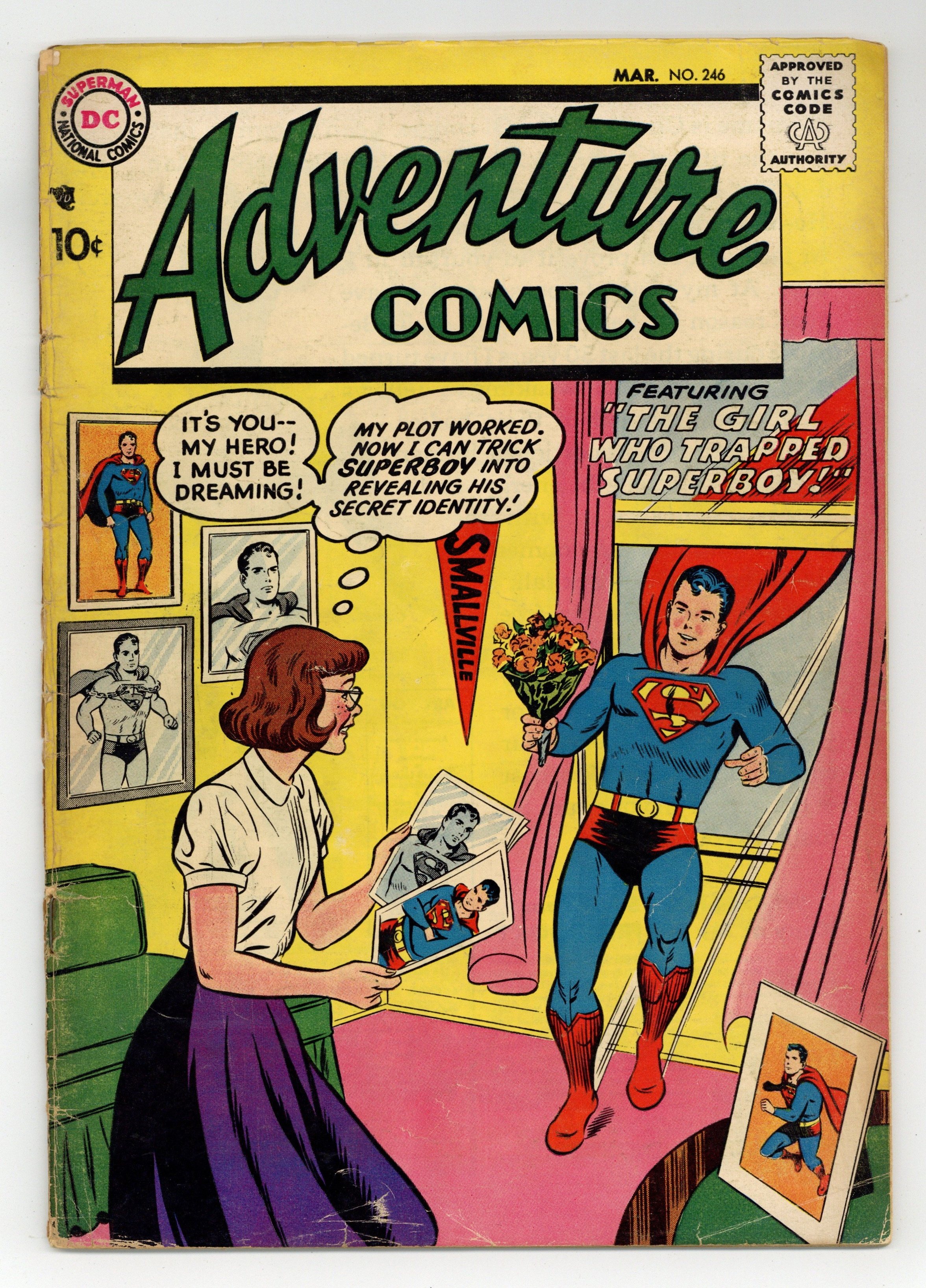 Cover pencils by Curt Swan, inks by Stan Kaye. The Girl Who Trapped Superboy, script by Otto Binder, pencils by Curt Swan, inks by Stan Kaye; a girl attempts to trick Superboy into revealing his secret identity. Varsity Vic humor page by Henry Boltinoff. Underwater Telescope--Superboy's Workshop activity page. The Town That Went Underwater starring Aquaman, art by Ramona Fradon. Little Pete humor page by Henry Boltinoff. The Rainbow Archer starring Green Arrow, script by France Herron, art by George Papp. 36 pages, Full Color. Cover price $0.10.
