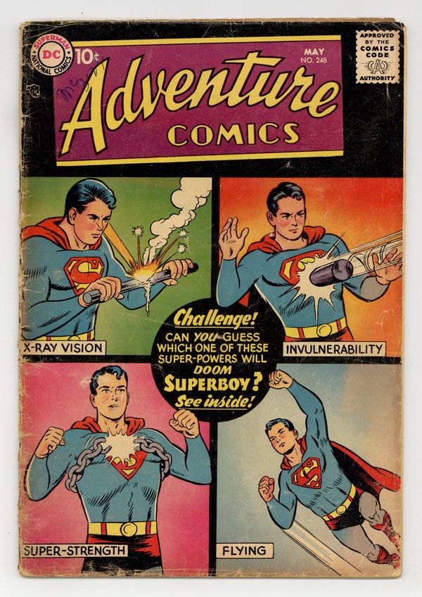 Cover pencils by Curt Swan, inks by Stan Kaye. The Great Super-Powers Contest starring Superboy, Lana Lang, Ma Kent, and Ace Grimes, script by Bill Finger, art by Creig Flessel; one of Superboys powers puts him in peril. New Adventures of Charlie Chan #1. Little Pete humor page by Henry Boltinoff. The World's Three Most Dangerous Arrows starring Green Arrow, script by France Herron, art by George Papp. Jerry the Jitterbug humor page by Henry Boltinoff. The Traitor of the Seven Seas starring Aquaman, art by Ramona Fradon. 36 pages, Full Color. Cover price $0.10.