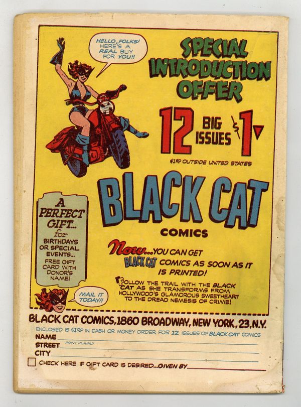 Edited by Leon Harvey. Cover by Al Avison. Stories by Lee Elias, Arturo Cazeneuve, George Roussos, Maurice Del Bourgo, and Art Helfant. The Black Cat in "The Buddha's Secret." Block Buster Barton in "The Mystery of the Missing Tenants." Johnny Nebisco in "The Billboard Murder Case!" Swamp Gold in "Dead Pirate's Gold!" Also "Lucifer's Lush!" 52 pages, full color. Cover price $0.10.