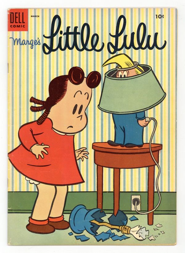 Published Mar 1955 by Dell/Gold Key.$16.75Cover art by Irving Tripp. Tubby Sitter; Tubby's mother and father hire Lulu to baby-sit for Tub. The Hungry Catcher; Tubby thinks up a scheme to get a clock for the clubhouse. The "Spider" Spins Again; Tubby thinks Lulu's pop shaved off his mustache to hide from the law. Ol' Witch Hazel and the Magic Doll; Lulu tells Alvin about when Hazel makes a magic doll in order to catch the poor little girl. The Raft; Wilbur and Gloria escape from an island in the lake by using Tubby as a raft. All scripts by John Stanley, art by Irving Tripp. Two-page text story, Lulus Diry ("Diary"). 36 pages, full color. Cover price $0.10.