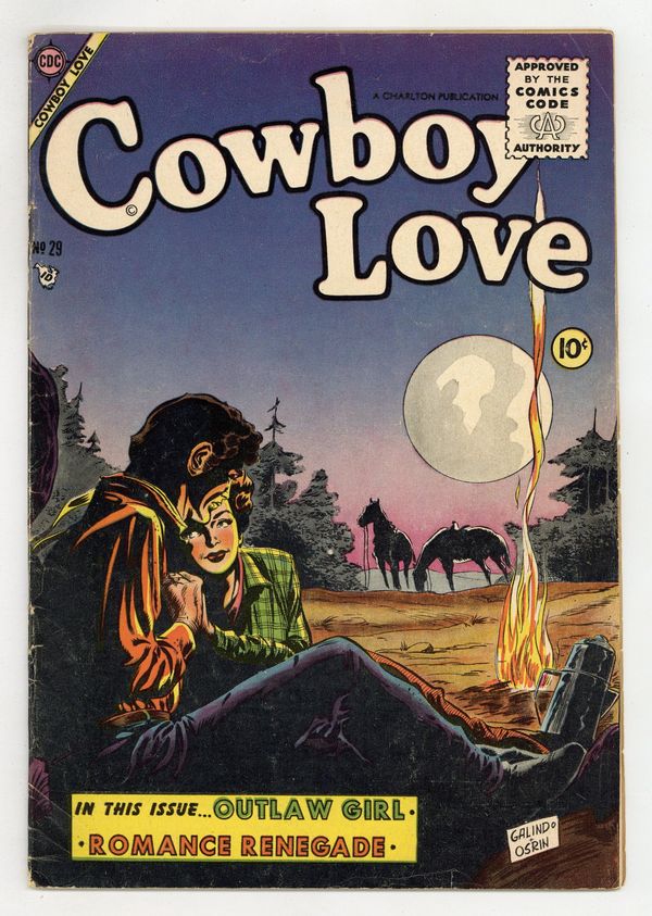 $86.00Cover by Ted Galindo and Ray Osrin. For those who love a little horse opera with their soap opera, Charlton presents tales of romance and heartbreak on the Western frontier. Action girl Jane takes over the sheriff's job after her father is disabled by an outlaw, but she didn't expect to meet a handsome stranger. Bob and Patty promise old prospector Sourdough Charley to keep his secret about the Hidden Valley and its gold, but they let it slip when they get back, and trouble follows. Wrongly accused of a sheriff's murder, Amy goes on the run, until she finds a refuge and a sympathetic ear from handsome homesteader Jeff. Romance Renegade; Hidden Valley; I Was Blinded by Love; Outlaw Girl! 32 pages, Full Color. Cover price $0.10.