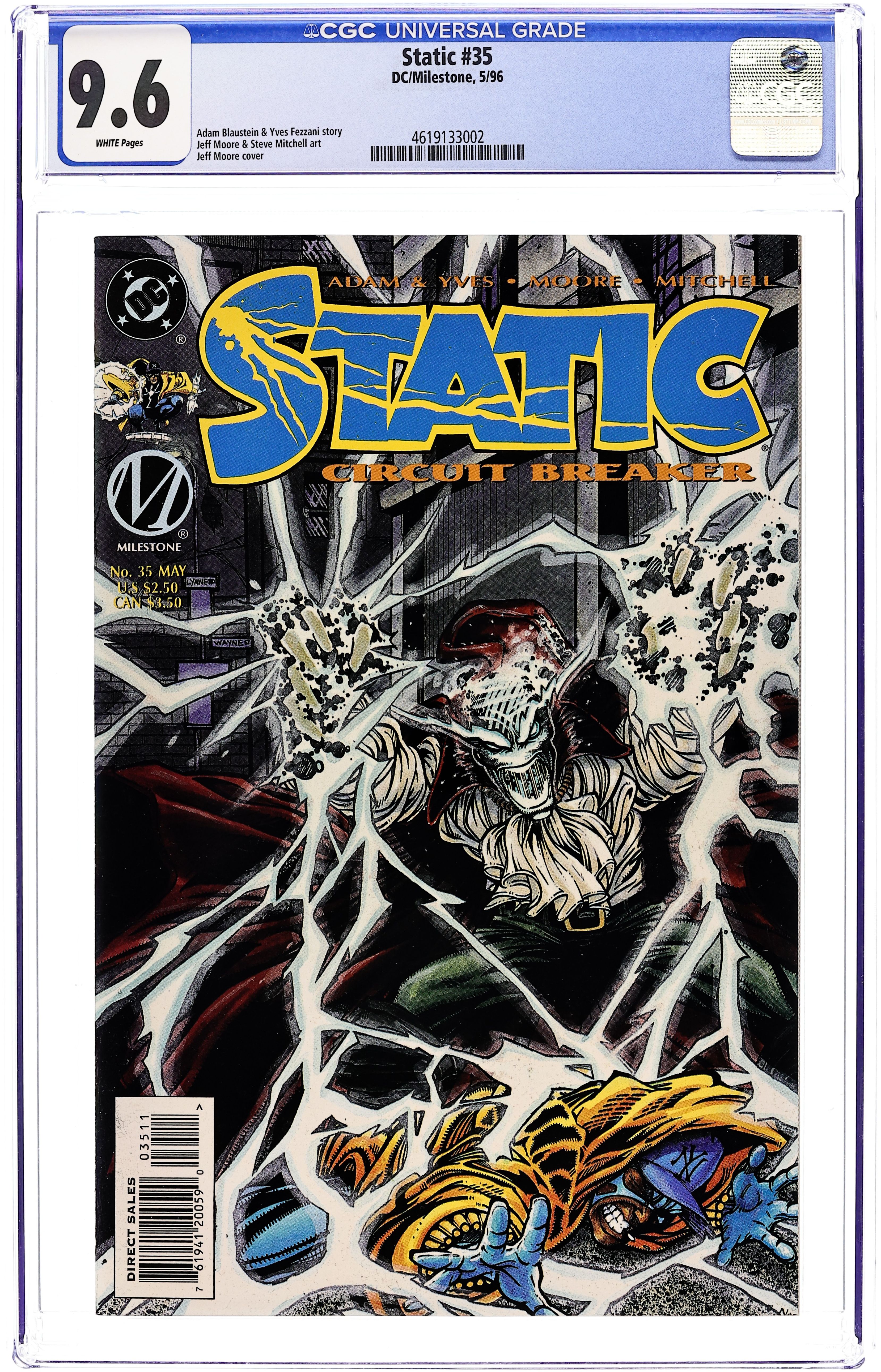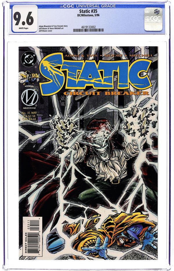 Grounded - Written by Adam Blaustein and Yves Fezzani. Art by Jeff Moore and Steve Mitchell. Cover by Jeff Moore. A Milestone series. There's a new Prometheus -- one who steals fire from man -- and he's leaving Dakota in darkness and without power. Now he's got Static dead in his sights as his next meal! Meanwhile, Dr. Kilgore, Virgil Hawkins's physician, gets closer to the secret of his very special patient. Fracote Format. 32 pages, full color. Cover price $2.50.