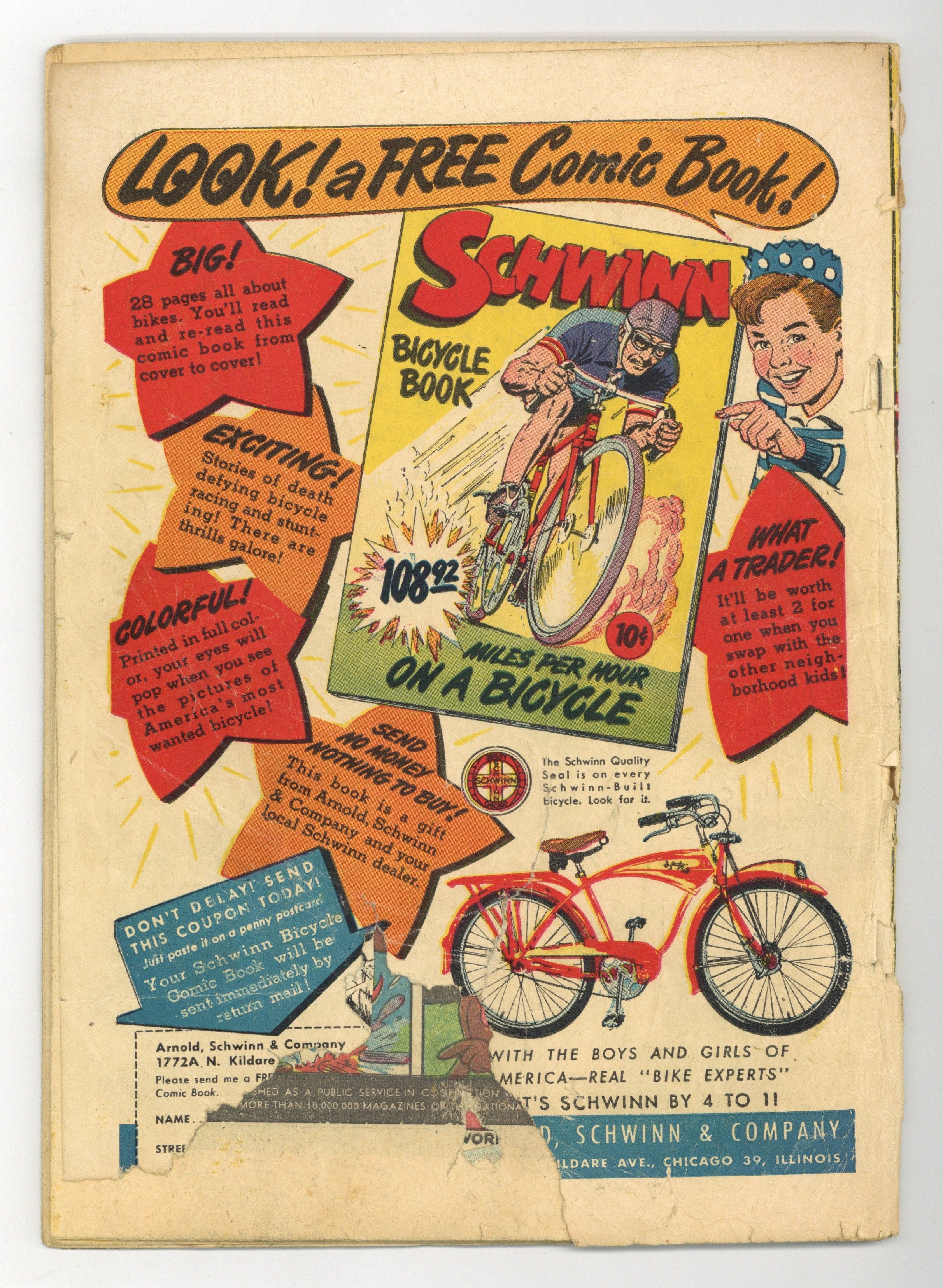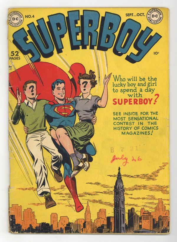 Cover pencils possibly by Wayne Boring, inks by Stan Kaye. The Oracle of Smallville! starring Superboy, pencils by John Sikela, inks by Ed Dobrotka. Super Safety Boy!, pencils by John Sikela, inks by Ed Dobrotka. The Backwoods Boy starring Daniel Boone. A Day in the Life of Dennis article on Dennis Day. Superboy Acrobat--Superboy's Workshop activity page. The Submarine Superboy!, pencils by John Sikela, inks by Ed Dobrotka. Smokey the Fire-Preventing Bear Comes to the Rescue of Peter Porkchops public service announcement starring Peter Porkchops, script by Jack Schiff, art by Rube Grossman. A full-page Wheaties ad featuring Stan Musial. "Who Will be the Lucky Boy and Girl to Spend a Day with Superboy" contest is cover featured. Sorry, contest ended Sept. 30, 1948! 52 Pages, Full Color. Cover price $0.10.