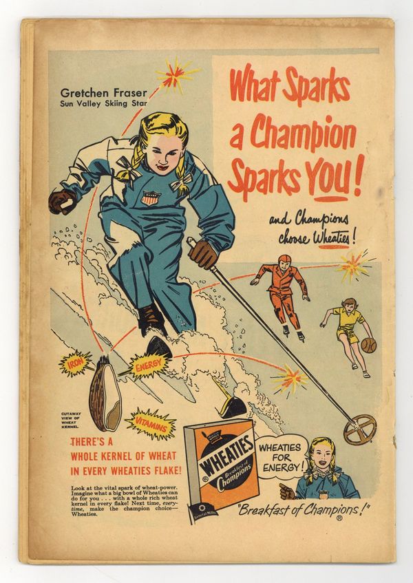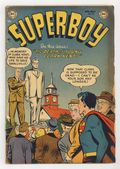 Cover art by Win Mortimer. Be Sure of Your Facts! public service announcement, script by Jack Schiff, art by Win Mortimer. The Death of Young Clark Kent! starring Superboy, pencils by John Sikela, inks by Ed Dobrotka; The people of Smallville are horrified when Clark is eaten by a slime monster from the center of the Earth. The Riddle of the Rarest Animals starring Superboy, pencils by John Sikela, inks by Ed Dobrotka; The Langs invite Clark to go to Africa with them. Our Gifted Children text article. Varsity Vic humor page by Henry Boltinoff. The School Without a Teacher! starring Superboy, script by Don Cameron, pencils by Curt Swan, inks by John Fischetti; All of Smallville's teachers are quarantined so Superboy has to take their places. 44 Pages, Full Color. Cover price $0.10.