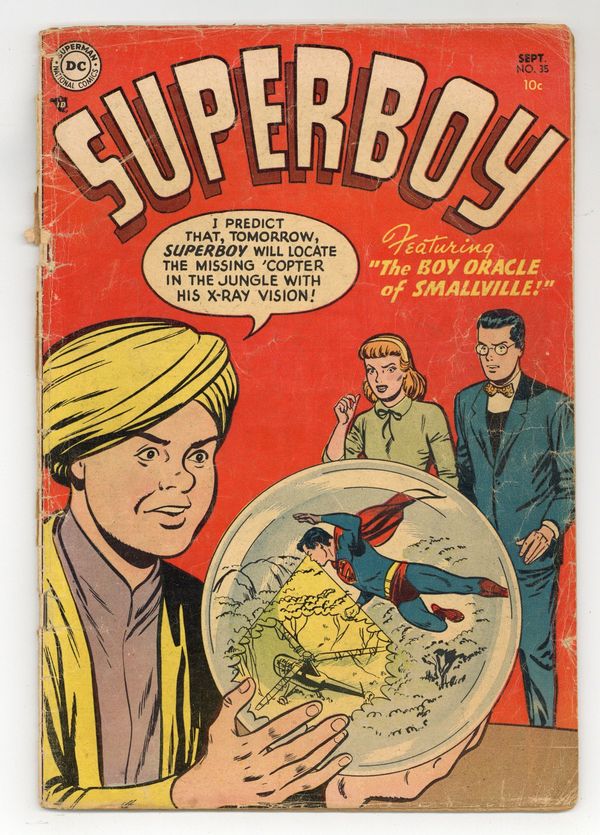 Cover art by Win Mortimer. Work Can Be Fun! public service announcement starring Buzzy, script by Jack Schiff, art by Win Mortimer. Clark Kent, Dog Catcher!, pencils by Curt Swan, inks by Sy Barry; When Lana is appointed Smallville Mayor for the Day, she appoints Clark Kent dogcatcher. Periscope--Superboy's Workshop. The Five Superboys!, pencils by Curt Swan, inks by Sy Barry; A criminal gathers together the four boys he thinks are most likely to be Superboy. Little Pete humor two-pager by Henry Boltinoff. Down to the Sea on Skis text article. The Boy Oracle of Smallville!, pencils by Curt Swan, inks by Sy Barry. 44 Pages, Full Color. Cover price $0.10.