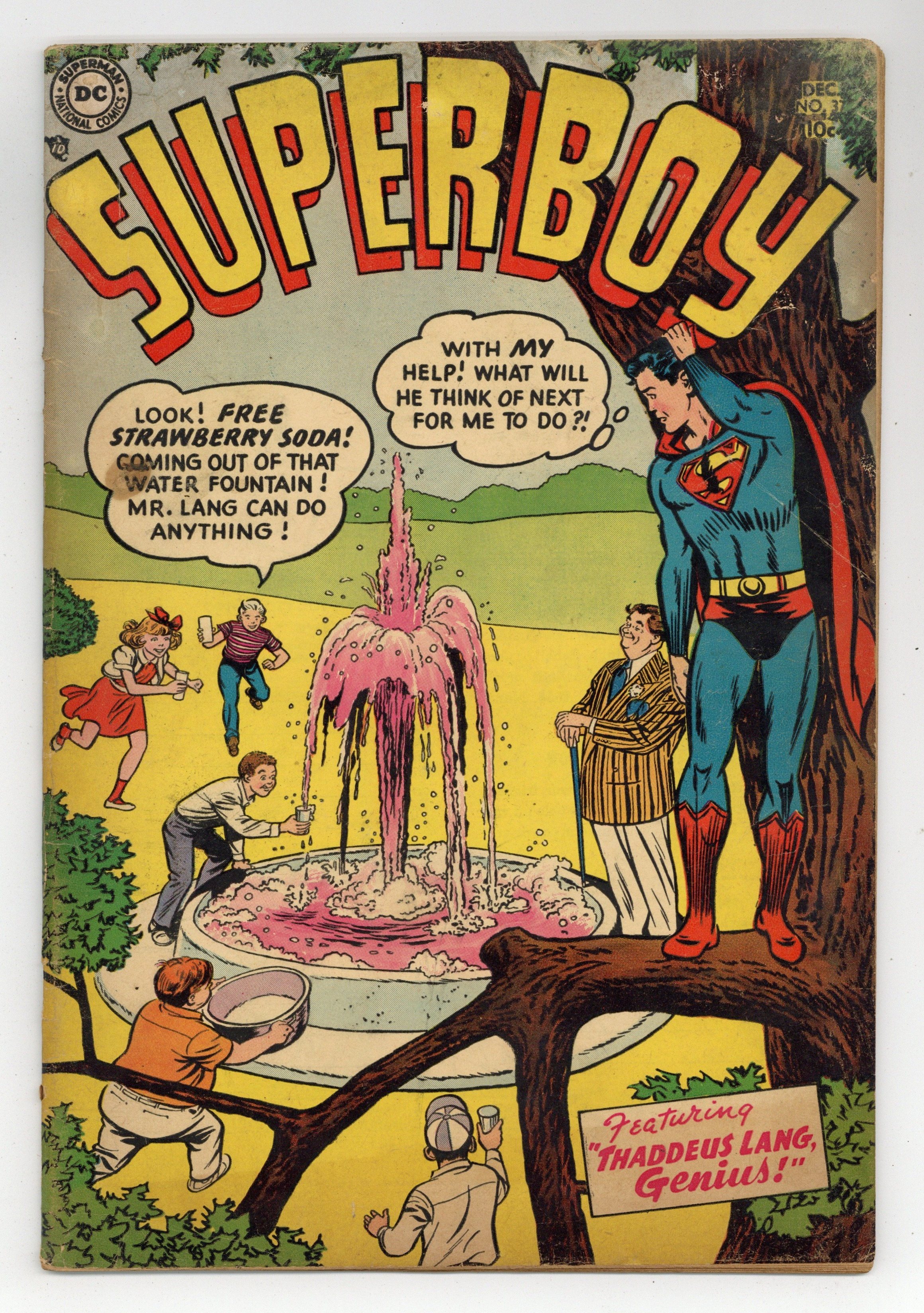 Cover pencils by Curt Swan, inks by Sy Barry. "The Three Who Defied Death!" starring Superboy and Lana Lang, script by Otto Binder, pencils by Curt Swan; Superboy helps three brothers complete dangerous jobs to pay for their mother's operation, and trips up a crook at the same time. Bebe humor page by Henry Boltinoff. "Clark Kent, Prisoner!" starring Superboy and Lana Lang, art by John Sikela; Clark Kent is kidnapped and held prisoner by a gang of crooks whom he believes have discovered his Superboy identity. Shorty humor page by Henry Boltinoff. Varsity Vic humor half-page by Henry Boltinoff. Sport Snaps half-page about hockey by Martin Naydel. "Thaddeus Lang, Genius!" starring Superboy, Jonathan Kent, Thaddeus Lang, Prof. Lang, Mrs. Lang, and Martha Kent, pencils by Curt Swan; After the Langs leave town to tend to Sarah's ailing sister, Prof. Lang's half-brother Thaddeus blows into town and proceeds to swindle all the Smallvillians he can find, until Superboy intervenes in his schemes. 44 Pages, Full Color. Cover price $0.10.