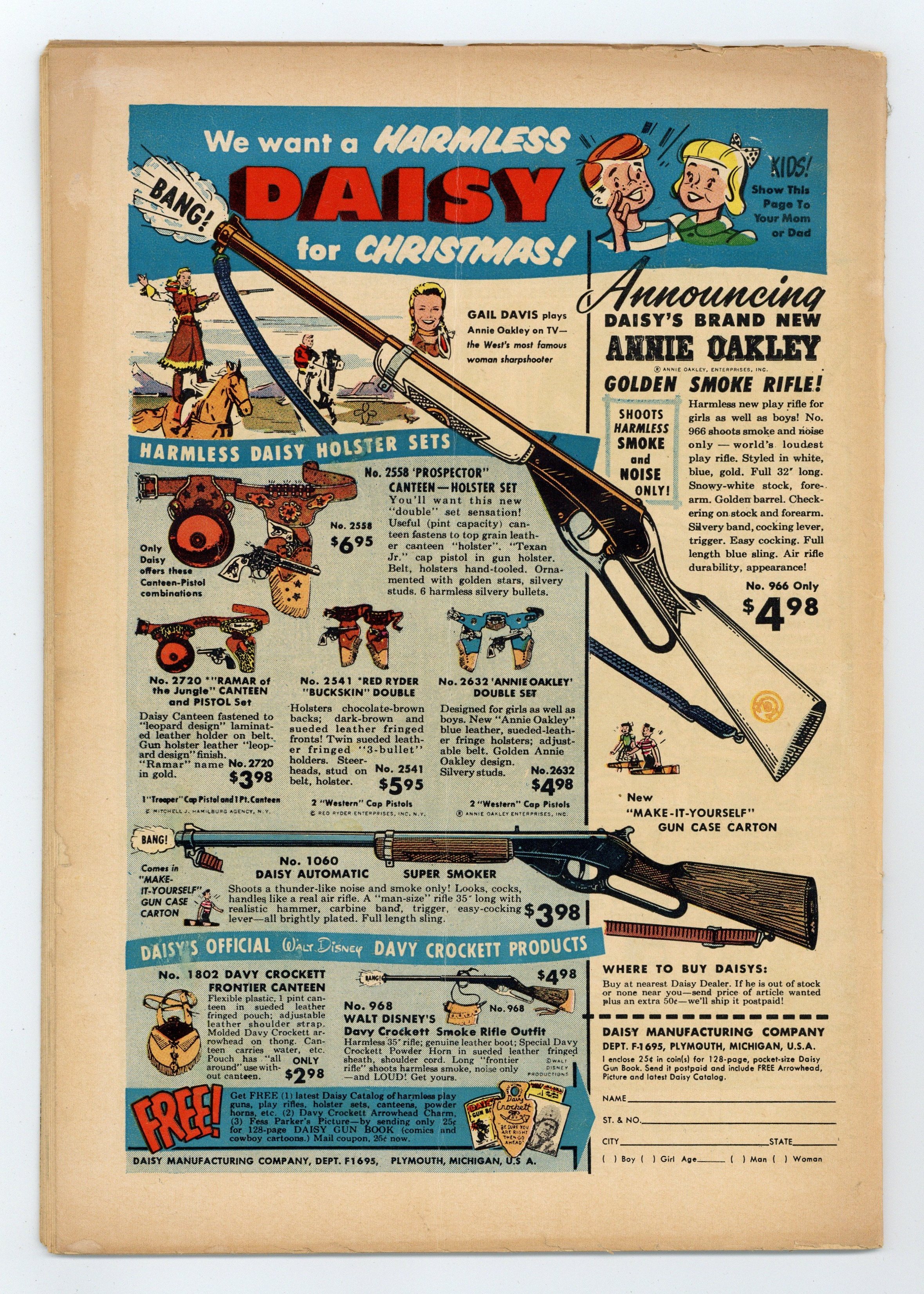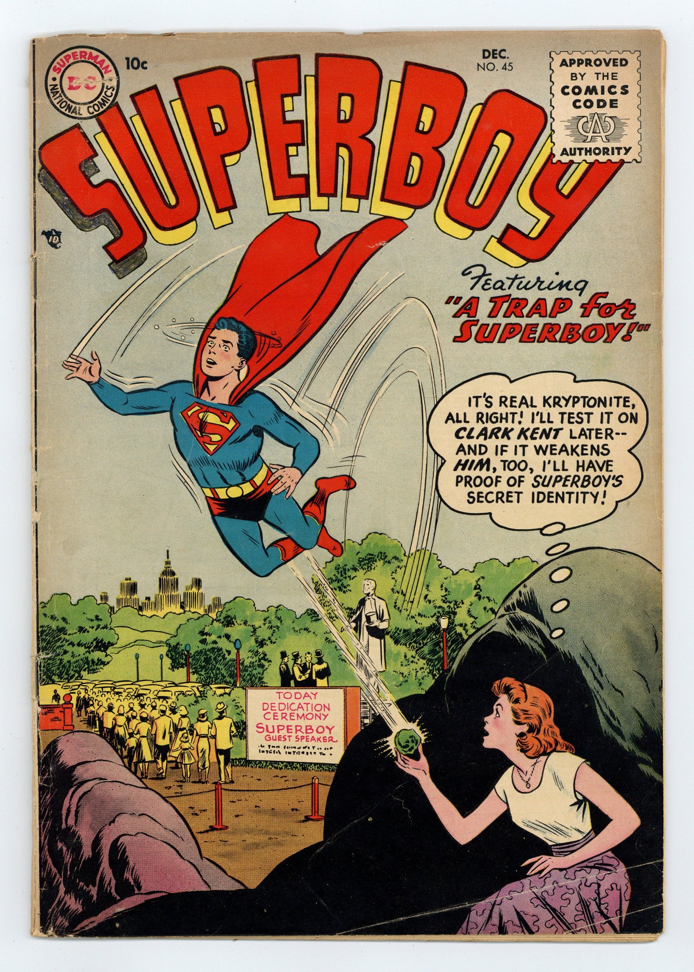 Cover pencils by Curt Swan, inks by Stan Kaye. Incredible Superboy Auction, art by John Sikela; After the General Store burns down, Pa must raise money and accidentally auctions off all of Clark's Superboy souvenirs. Bat Kite --Superboy's Workshop activity page. The Secret of the Super Charades, script by Otto Binder, art by John Sikela. Varsity Vic humor page by Henry Boltinoff. The Man Who Owned a Volcano text story by Jack Miller. A Trap for Superboy!, art by John Sikela; Lana Lang stumbles on a piece of kryptonite and tries to prove Clark is Superboy. How a Nation Is Born public service announcement, script by Jack Schiff, inks by Win Mortimer. 36 Pages, Full Color. Cover price $0.10.
