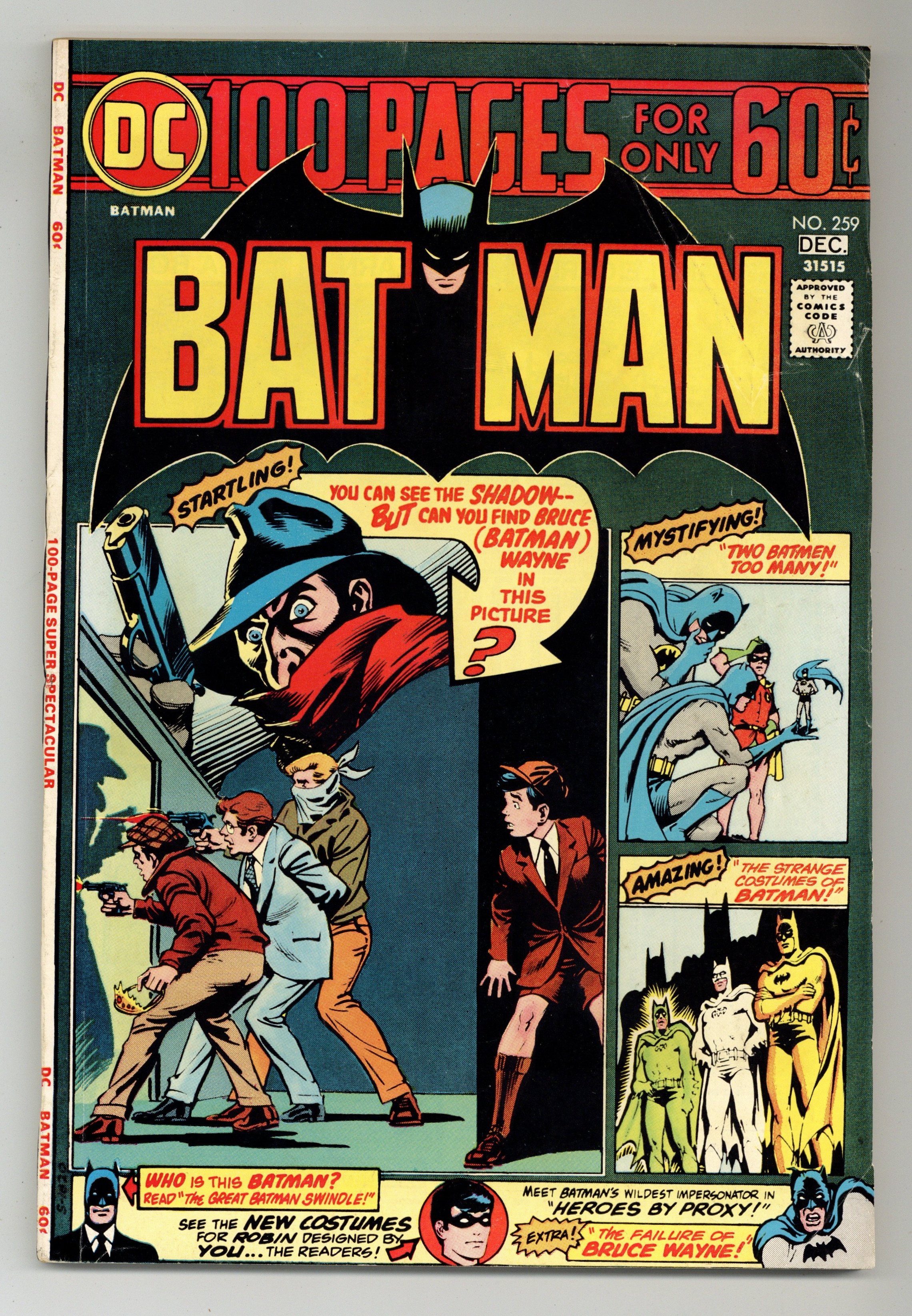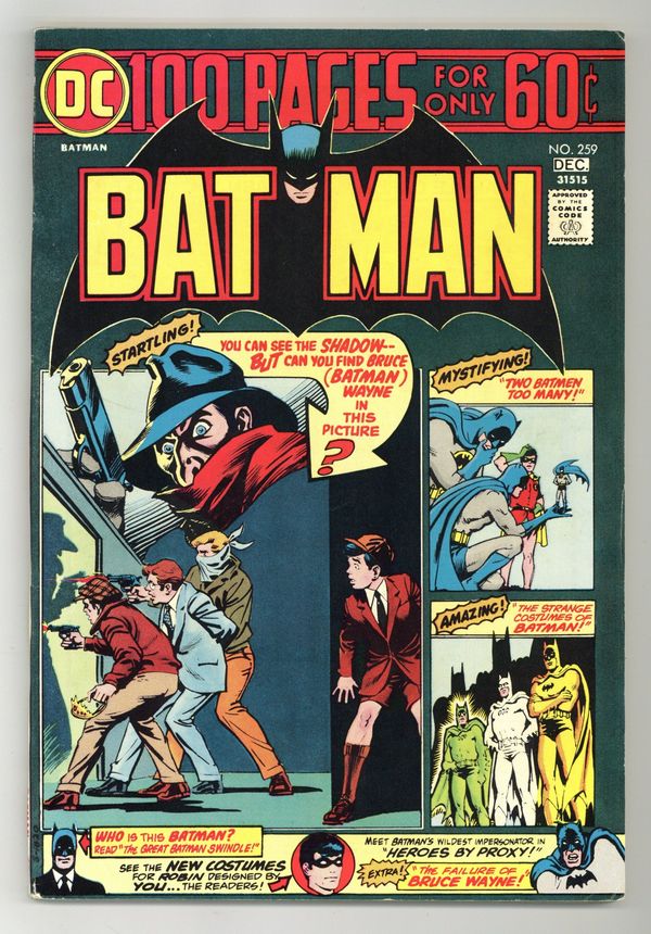 100-page giant. Cover art by Nick Cardy. Batman and the Shadow team-up in this issue in a new story titled "Night of the Shadow!", script by Denny O'Neil, pencils by Irv Novick, inks by Dick Giordano); Batman goes on the trail of a convicted felon from the past, believing that he has stolen a valuable tiara. But he's wrong and discovers that only "The Shadow Knows" who actually is responsible. "The Great Batman Swindle!" (reprinted from Detective Comics #222), script by Bill Finger, pencils by Dick Sprang, inks by Charles Paris; Wealthy yachtsman Ned Judson is called to a mysterious castle once built by an eccentric millionaire, and comes face-to-face with the Brotherhood of Batmen; The leader, Batman Number One, convinces Judson that the figure of Batman is actually four people. "The Strange Costumes of Batman!" (from Detective Comics #165), script by Edmond Hamilton, pencils by Dick Sprang (as Bob Kane), inks by Charles Paris; While making an inspection of equipment in the Bat-Cave, Bruce and Dick also must inspect the various costumes Batman and Robin use in their fight against crime for leaks and tears, and, as it turns out, a never before used costume saves the day for the Batman, who has been seriously wounded. New costumes for Robin drawn by readers of the strip. "Heroes by Proxy!" (from Batman #29), script by Don Cameron, art by Dick Sprang (as Bob Kane); Two private detectives are down in the dumps because they are flat broke, even though they have great detective abilities; When they hear that the Wayne Mansion has been robbed, they decide to change their tactics and investigate, disguised as Batman and Robin! "Two Batmen Too Many!" (from Batman #177), script by Bill Finger, pencils by Sheldon Moldoff (as Bob Kane), inks by Joe Giella; Batman concocts a scheme against numbers racketeer Ed Garvey to prove conclusively that the crook planned and carried out the Kimber Gem job. "The Failure of Bruce Wayne" (from Batman #120), script by Bill Finger, pencils by Sheldon Moldoff, inks by Charles Paris; Called to his dying Uncle's bedside, Silas, Bruce is told by him that he is disappointed that Bruce has not continued the family tradition of adventure; Bruce sets out to prove Silas wrong. 100 Pages, Full Color. Cover price $0.60.