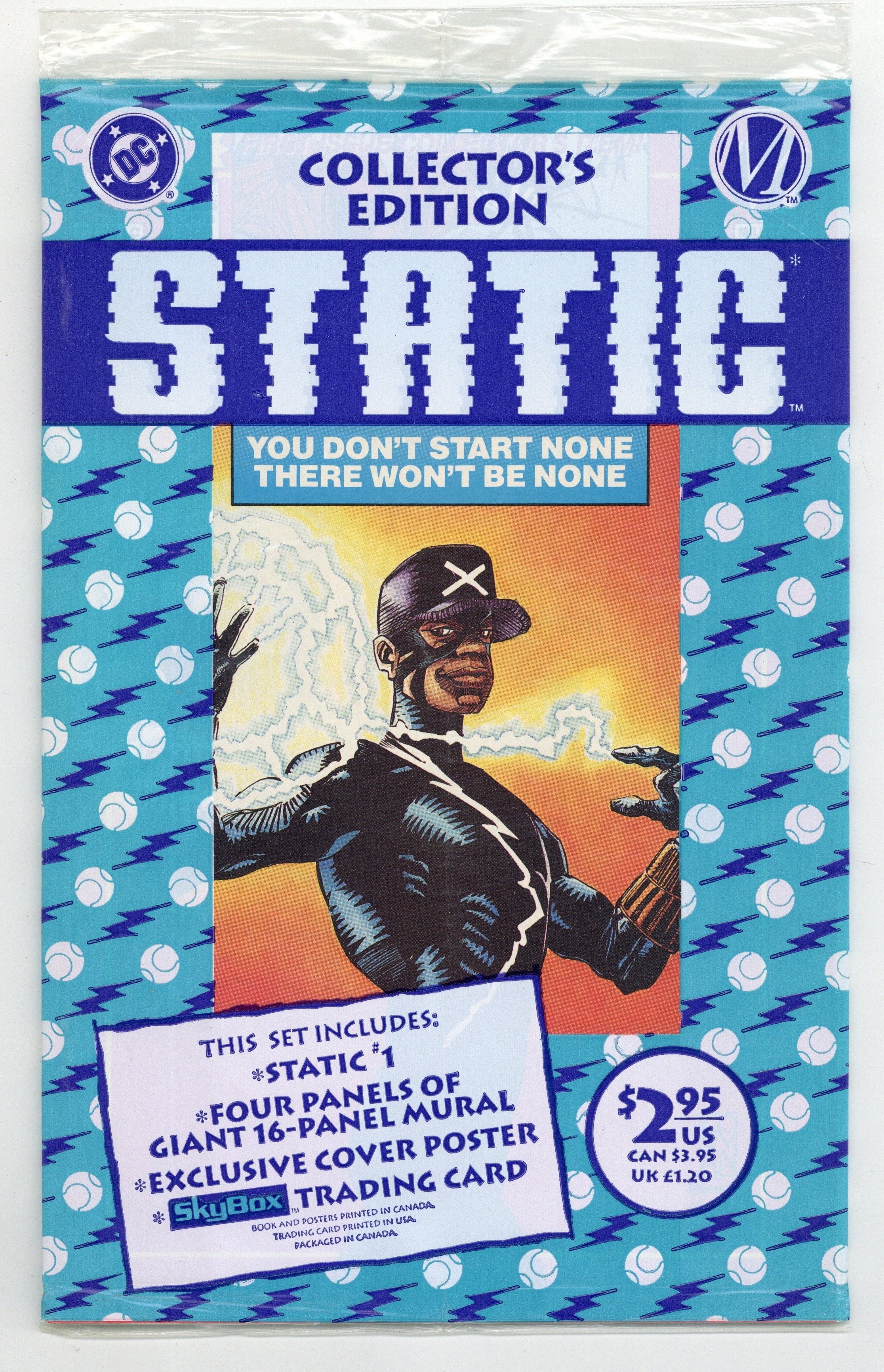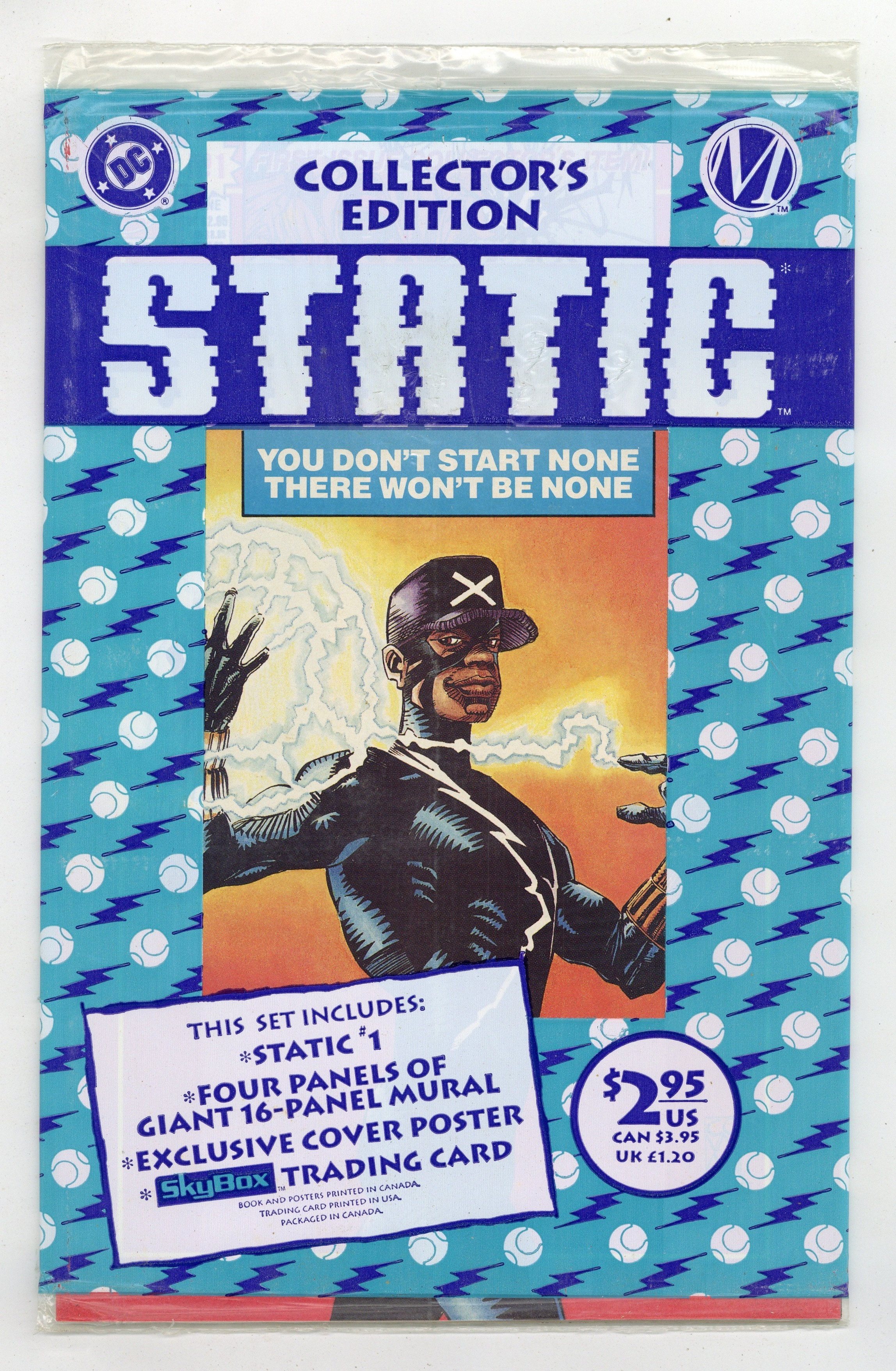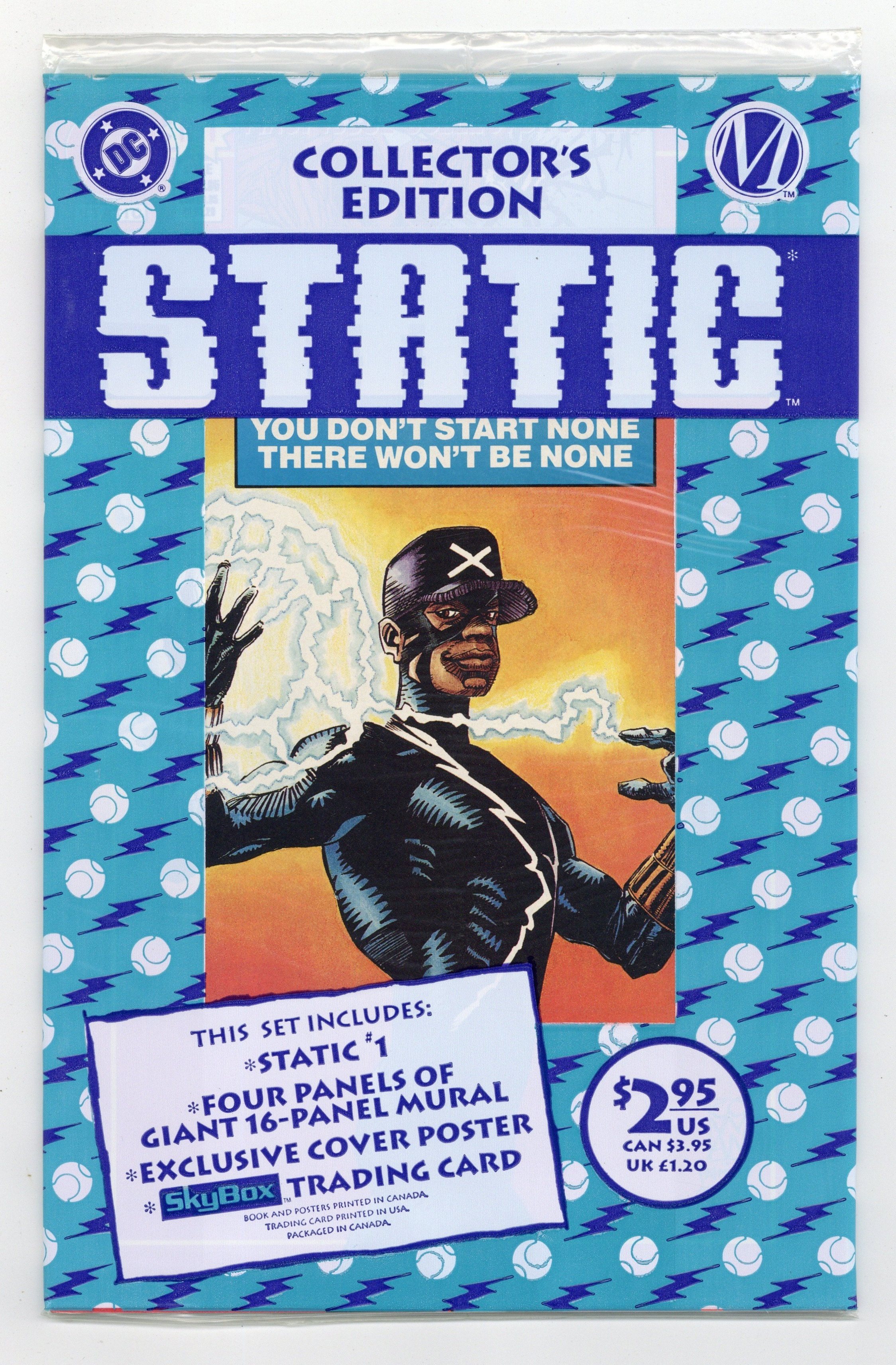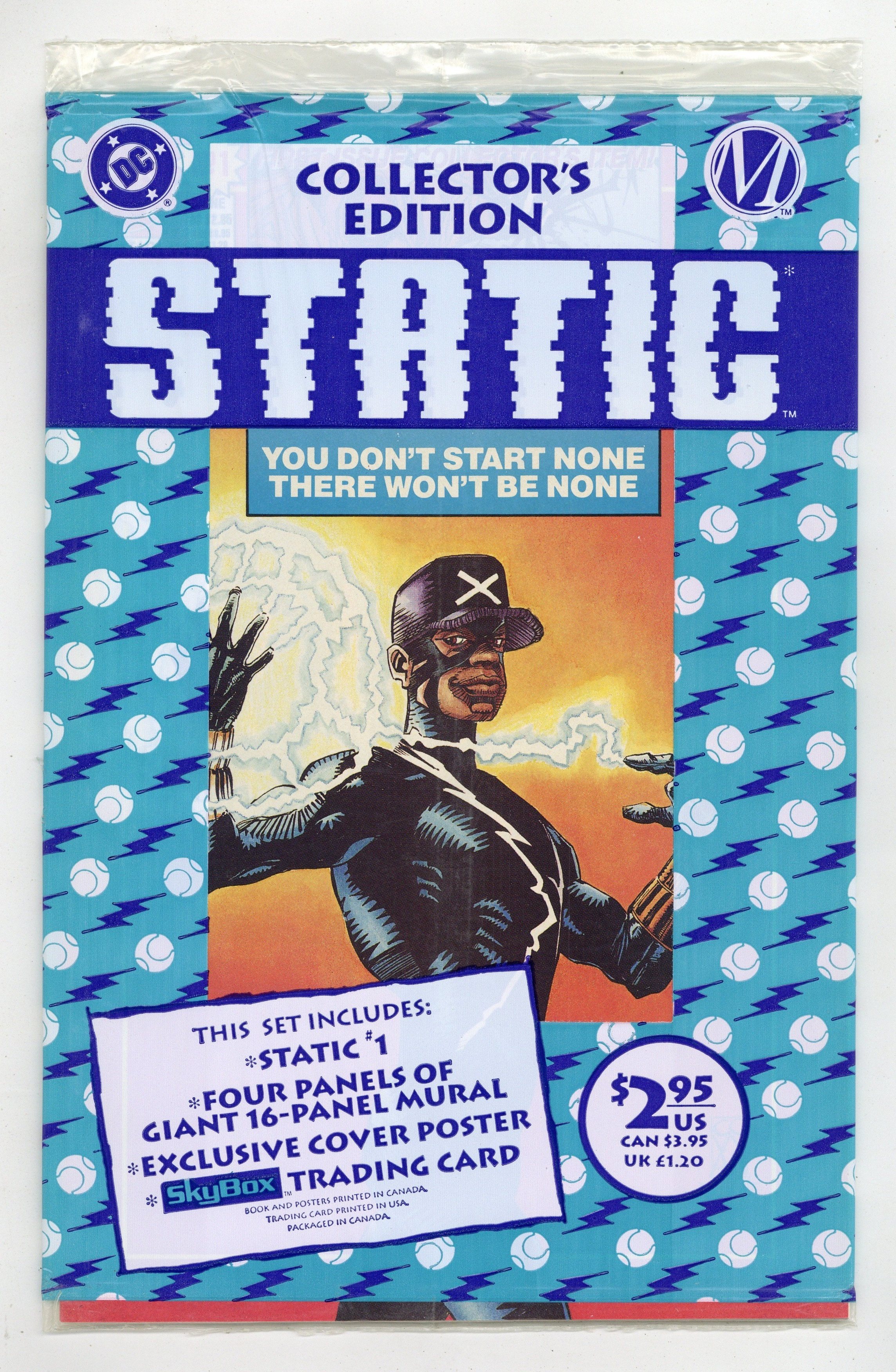 Direct Edition polybagged with: 1)Four panels of Giant 16-panel mural; 2) Exclusive cover poster; and 3) a Skybox trading card. Cover by Denys Cowan and Jimmy Palmiotti. Burning Sensation [Trial by Fire, Chapter One], script by Dwayne McDuffie and Robert L. Washington III, art by John Paul Leon and Steve Mitchell; Frieda goes to Akkad's place where the five alarm crew is waiting to take her somewhere; Static steps in and defeats them; Frieda goes home; Virgil asks Larry about asking Frieda out; Larry says he thinks Frieda believes they're just friends; the five alarm crew take Frieda to Hot-Streak; Static battles Hot-Streak, but when he sees his face he stops fighting and is defeated en by him. 36 pgs., full color. $2.95. Cover price $2.95.