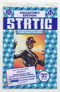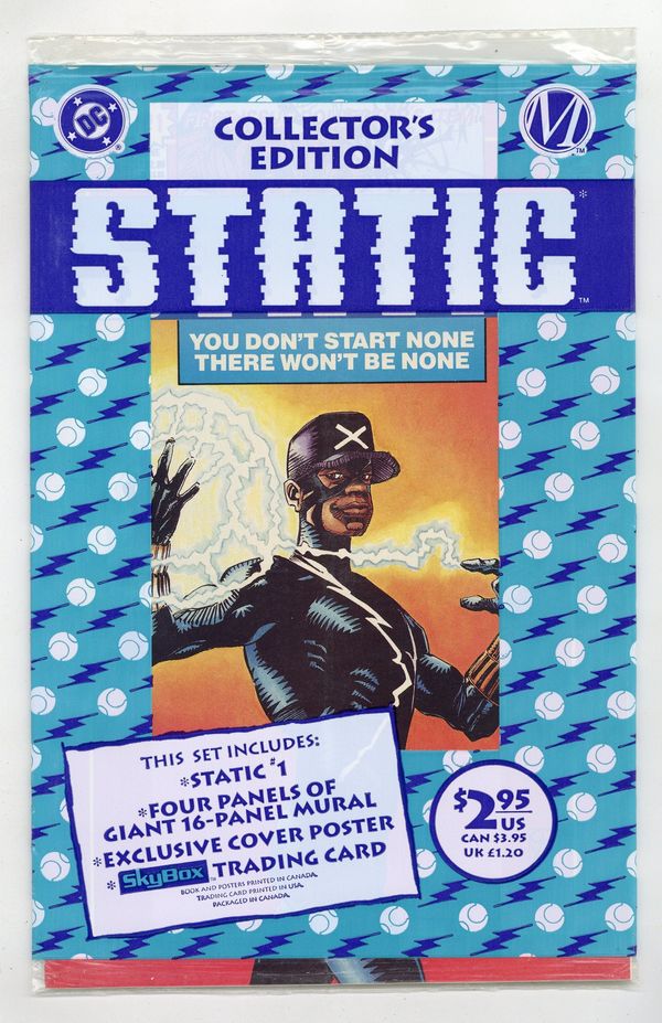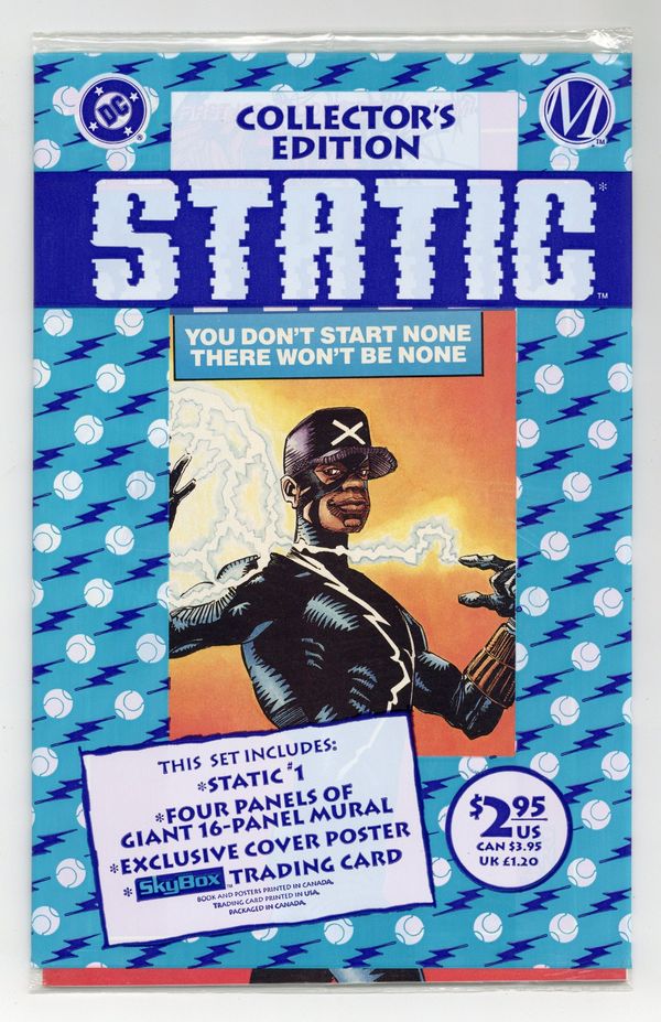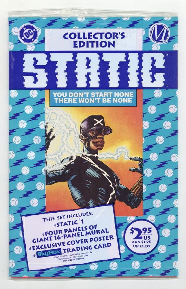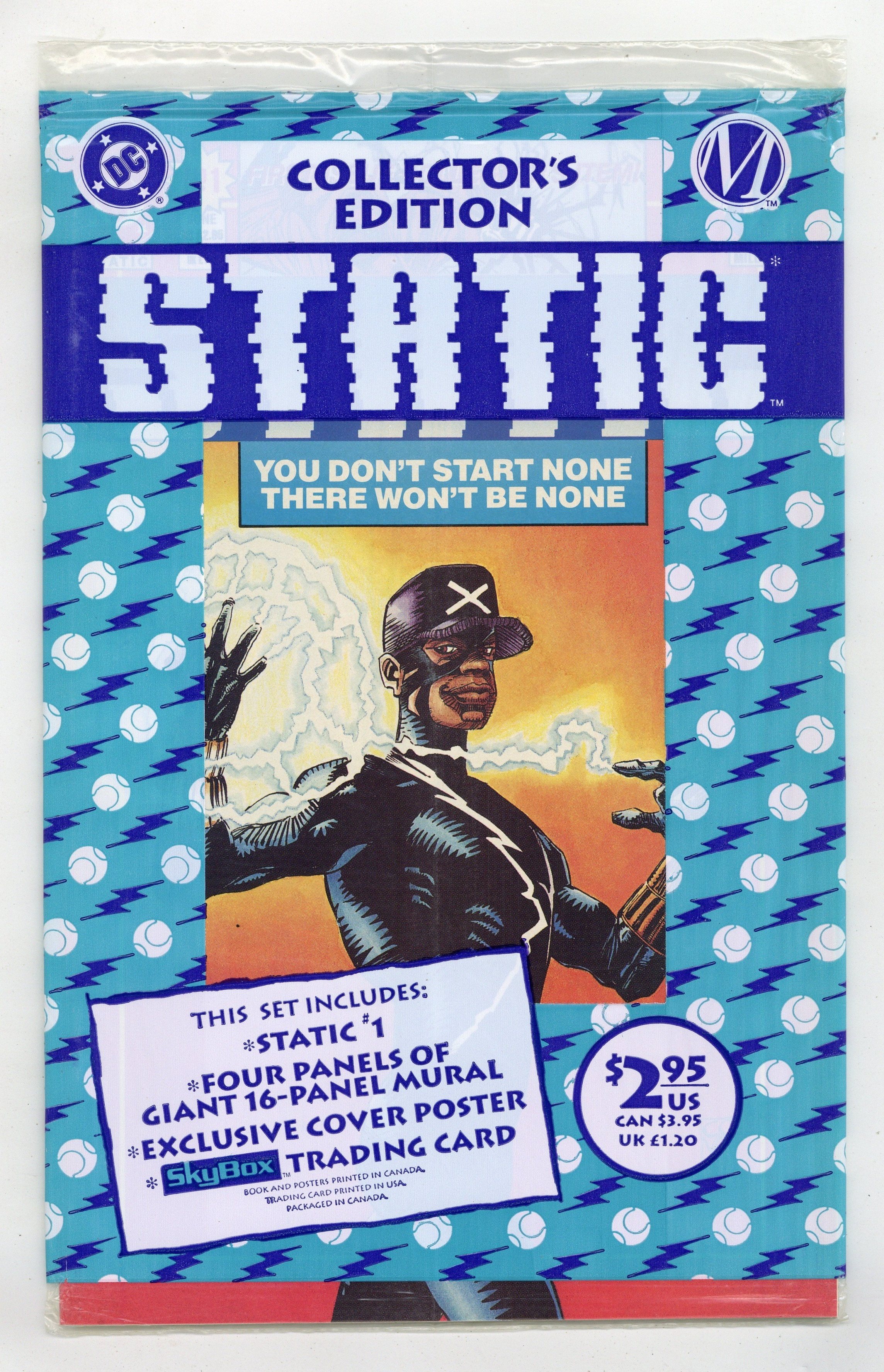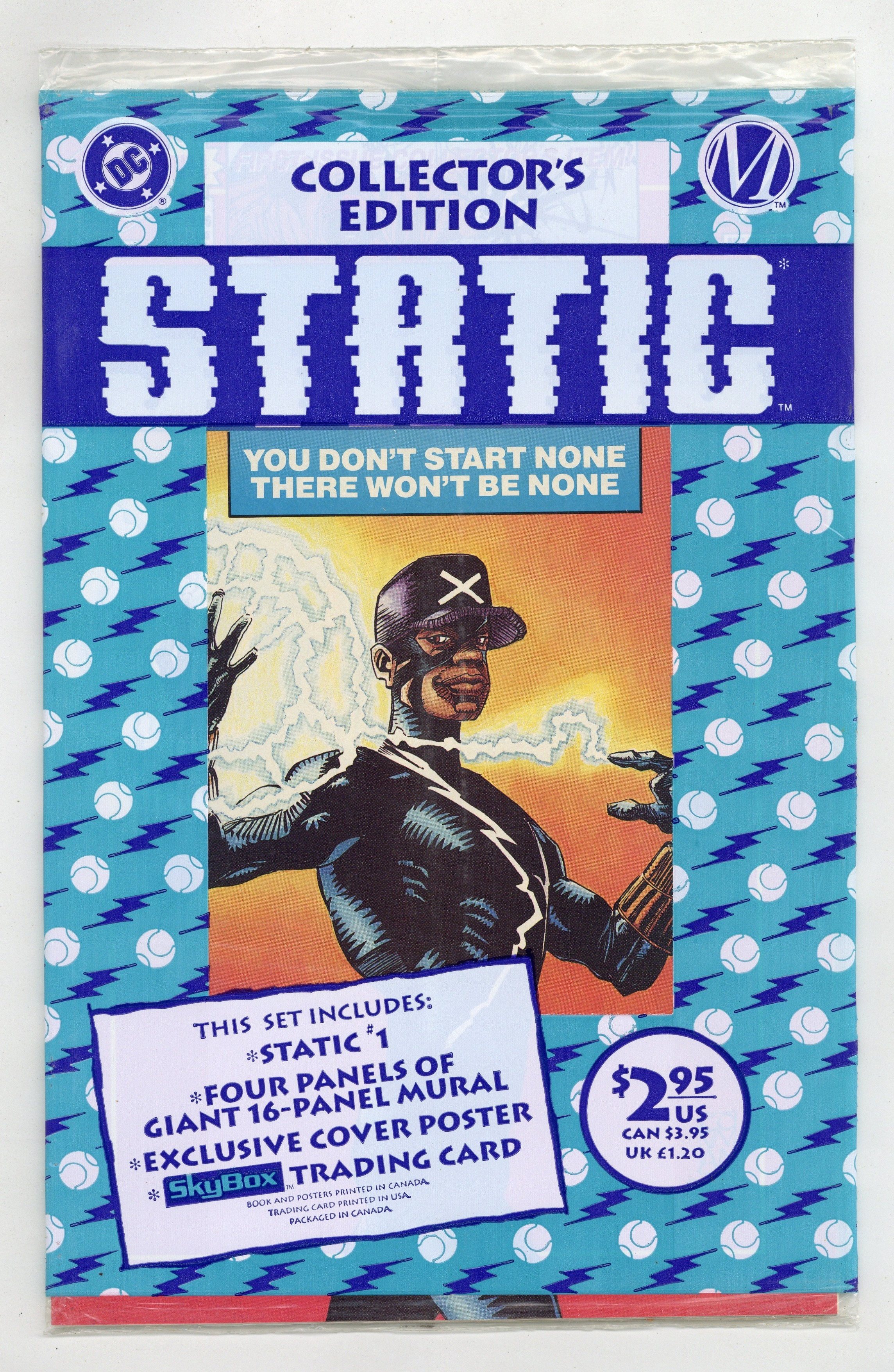 Direct Edition polybagged with: 1)Four panels of Giant 16-panel mural; 2) Exclusive cover poster; and 3) a Skybox trading card. Cover by Denys Cowan and Jimmy Palmiotti. Burning Sensation [Trial by Fire, Chapter One], script by Dwayne McDuffie and Robert L. Washington III, art by John Paul Leon and Steve Mitchell; Frieda goes to Akkad's place where the five alarm crew is waiting to take her somewhere; Static steps in and defeats them; Frieda goes home; Virgil asks Larry about asking Frieda out; Larry says he thinks Frieda believes they're just friends; the five alarm crew take Frieda to Hot-Streak; Static battles Hot-Streak, but when he sees his face he stops fighting and is defeated en by him. 36 pgs., full color. $2.95. Cover price $2.95.