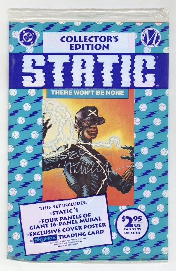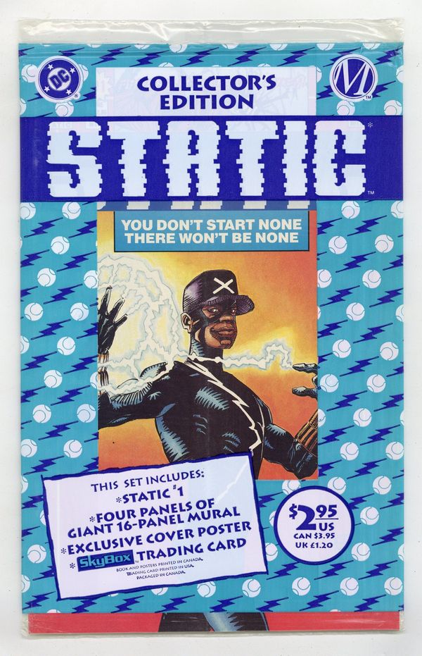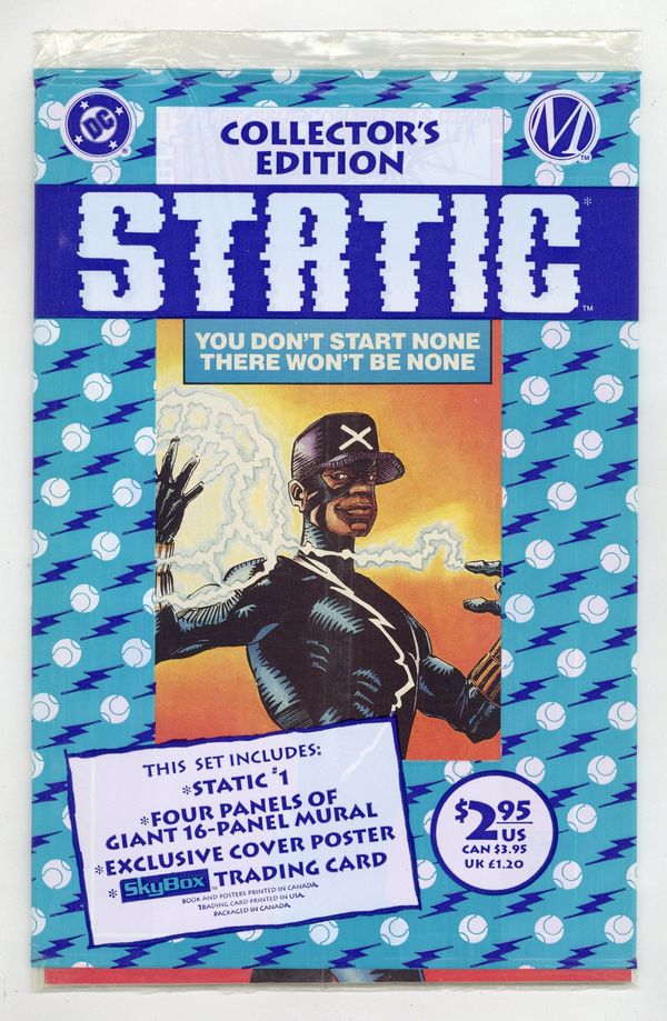 $10.50Direct Edition polybagged with: 1)Four panels of Giant 16-panel mural; 2) Exclusive cover poster; and 3) a Skybox trading card. Cover by Denys Cowan and Jimmy Palmiotti. Burning Sensation [Trial by Fire, Chapter One], script by Dwayne McDuffie and Robert L. Washington III, art by John Paul Leon and Steve Mitchell; Frieda goes to Akkad's place where the five alarm crew is waiting to take her somewhere; Static steps in and defeats them; Frieda goes home; Virgil asks Larry about asking Frieda out; Larry says he thinks Frieda believes they're just friends; the five alarm crew take Frieda to Hot-Streak; Static battles Hot-Streak, but when he sees his face he stops fighting and is defeated en by him. 36 pgs., full color. $2.95. Cover price $2.95.