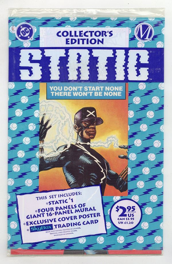 $8.20Direct Edition polybagged with: 1)Four panels of Giant 16-panel mural; 2) Exclusive cover poster; and 3) a Skybox trading card. Cover by Denys Cowan and Jimmy Palmiotti. Burning Sensation [Trial by Fire, Chapter One], script by Dwayne McDuffie and Robert L. Washington III, art by John Paul Leon and Steve Mitchell; Frieda goes to Akkad's place where the five alarm crew is waiting to take her somewhere; Static steps in and defeats them; Frieda goes home; Virgil asks Larry about asking Frieda out; Larry says he thinks Frieda believes they're just friends; the five alarm crew take Frieda to Hot-Streak; Static battles Hot-Streak, but when he sees his face he stops fighting and is defeated en by him. 36 pgs., full color. $2.95. Cover price $2.95.