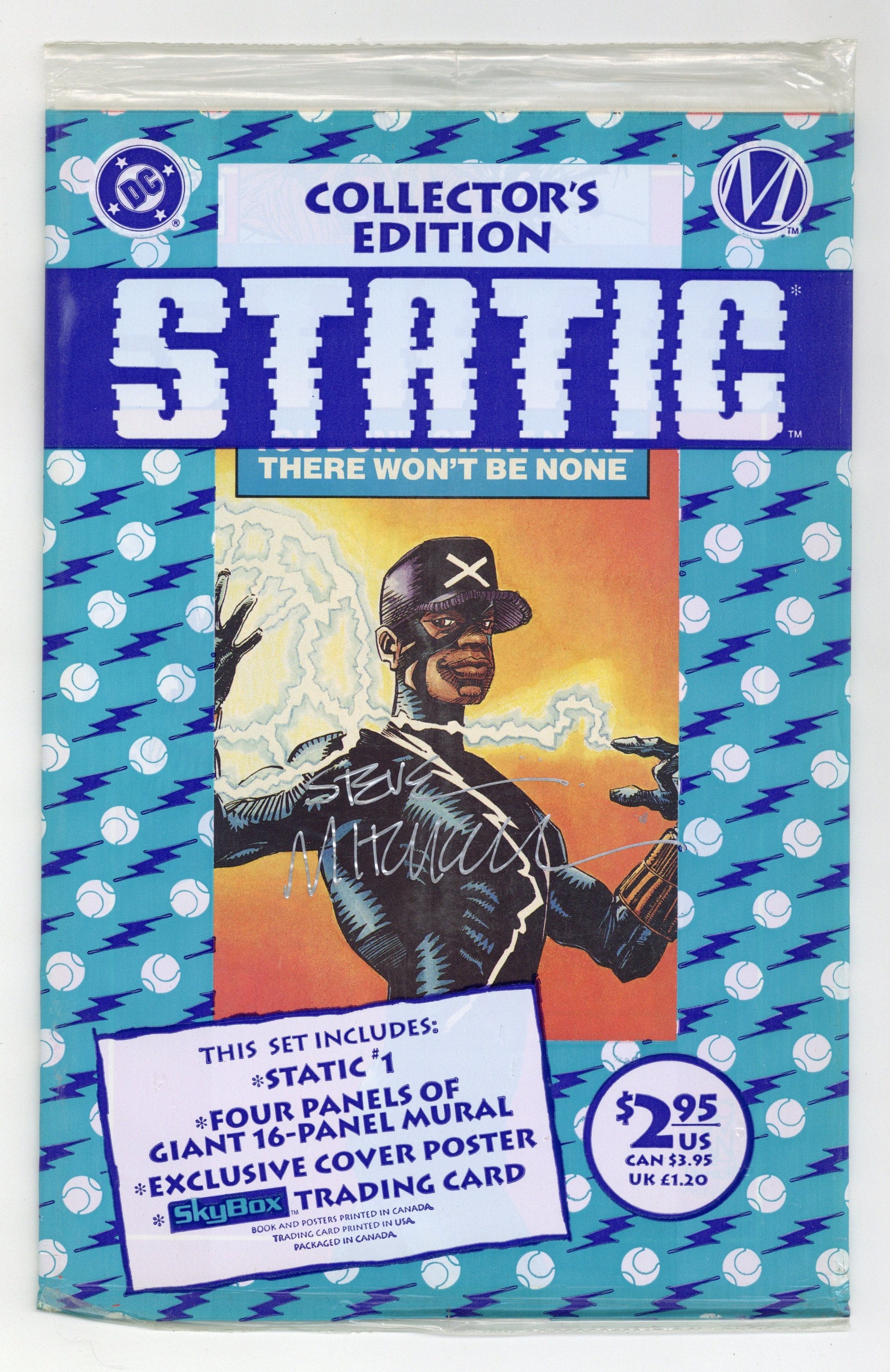 $9.70Direct Edition polybagged with: 1)Four panels of Giant 16-panel mural; 2) Exclusive cover poster; and 3) a Skybox trading card. Cover by Denys Cowan and Jimmy Palmiotti. Burning Sensation [Trial by Fire, Chapter One], script by Dwayne McDuffie and Robert L. Washington III, art by John Paul Leon and Steve Mitchell; Frieda goes to Akkad's place where the five alarm crew is waiting to take her somewhere; Static steps in and defeats them; Frieda goes home; Virgil asks Larry about asking Frieda out; Larry says he thinks Frieda believes they're just friends; the five alarm crew take Frieda to Hot-Streak; Static battles Hot-Streak, but when he sees his face he stops fighting and is defeated en by him. 36 pgs., full color. $2.95. Cover price $2.95.