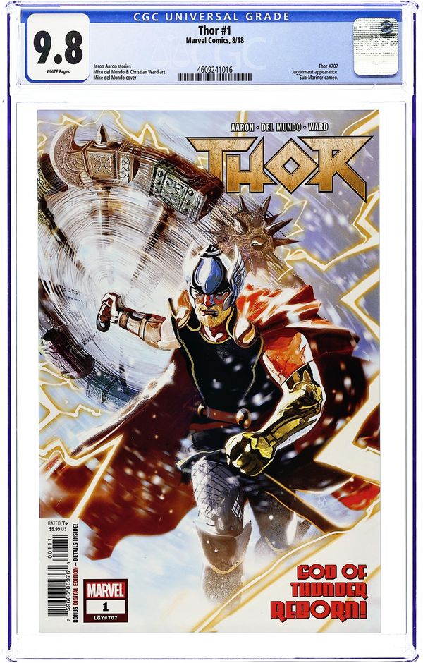 Written by Jason Aaron. Art by Michael Del Mundo and Christian Ward. Cover by Michael Del Mundo. JASON AARON & MIKE DEL MUNDO TAKE THE PRINCE OF ASGARD IN A WHOLE NEW DIRECTION! Thor Odinson has regained his mantle - and with it, a wild new world of trouble on his mighty hands! The artifacts of Asgard have been scattered across the earth, and to reclaim them, Thor will have to face some ugly truths. Like the production cost of hundreds of new hammers! And the Thunder God is going to need every last one of them if he's going to stop the unstoppable Juggernaut. Jason Aaron takes the Prince of Asgard in a whole new direction with YOUNG GUN artist Mike Del Mundo joining him at the helm! And don't miss the latest chapter of the King Thor saga with acclaimed BLACK BOLT artist Christian Ward, as the Thor of the far future encounters an old friend who's undergone some startling changes. 48 pages, full color. Rated T+ Cover price $5.99.