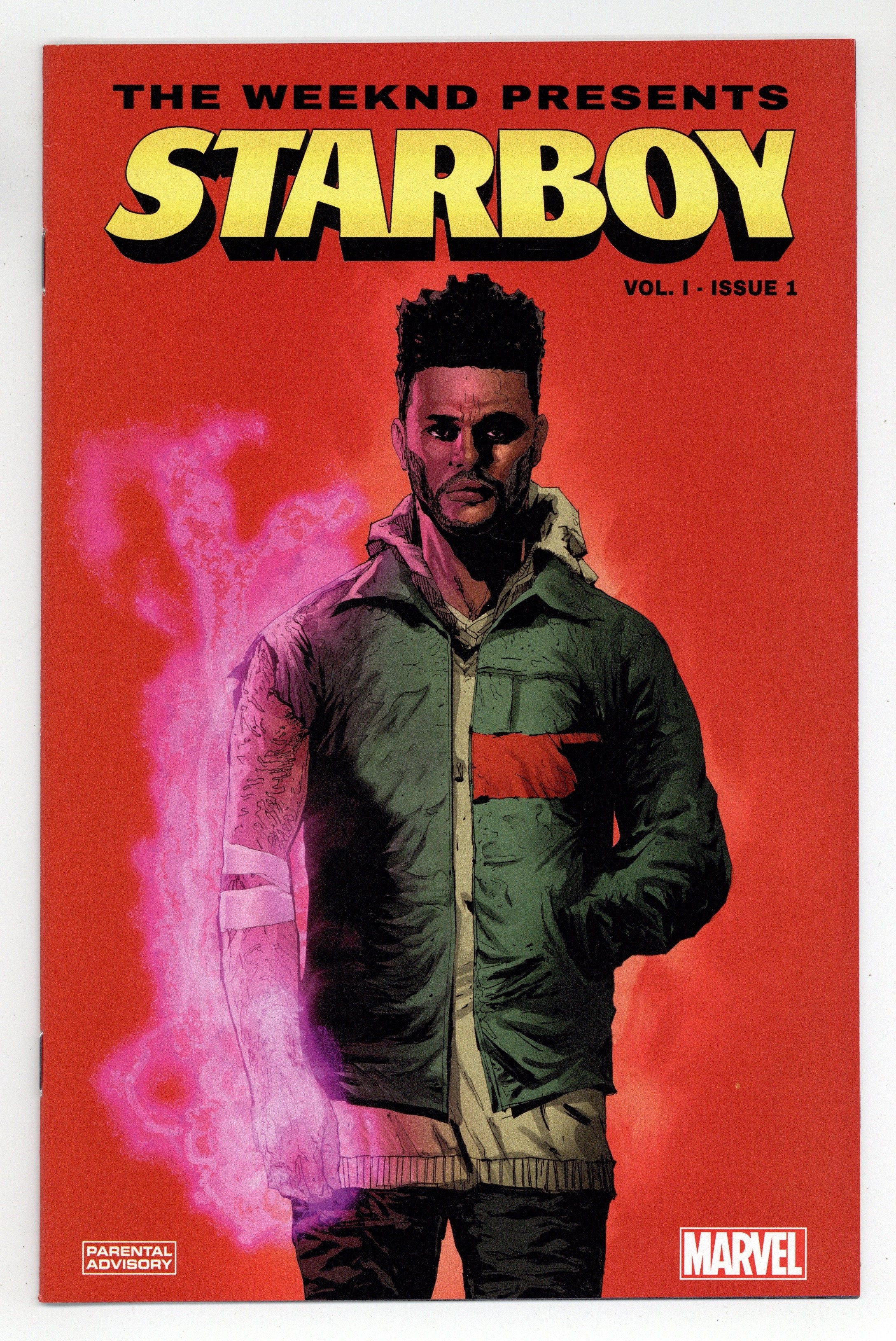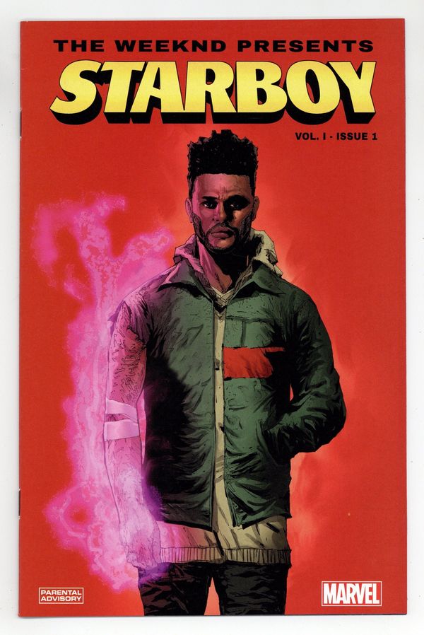 Written by Abel "The Weeknd" Tesfaye, La Mar Taylor and Christos Gage. Art by Eric Nguyen and Guru eFX. Cover by Eric Nguyen. Based on the chart-topping song from the double-platinum album STARBOY by THE WEEKND. The city of Alphatron is in the grip of a crime wave, as the terrifying Jack 'The Chef' Smiley has unified all criminal organizations with his ruthlessness and strategic genius. Not content with brutally murdering his victims, Smiley also feasts upon their flesh. The citizens live in fear and the police have been directly targeted. The city is in dire need of a hero. It will not get one… …but it will get what it deserves. STARBOY. 24 pages, full color. Parental Advisory Cover price $3.99.