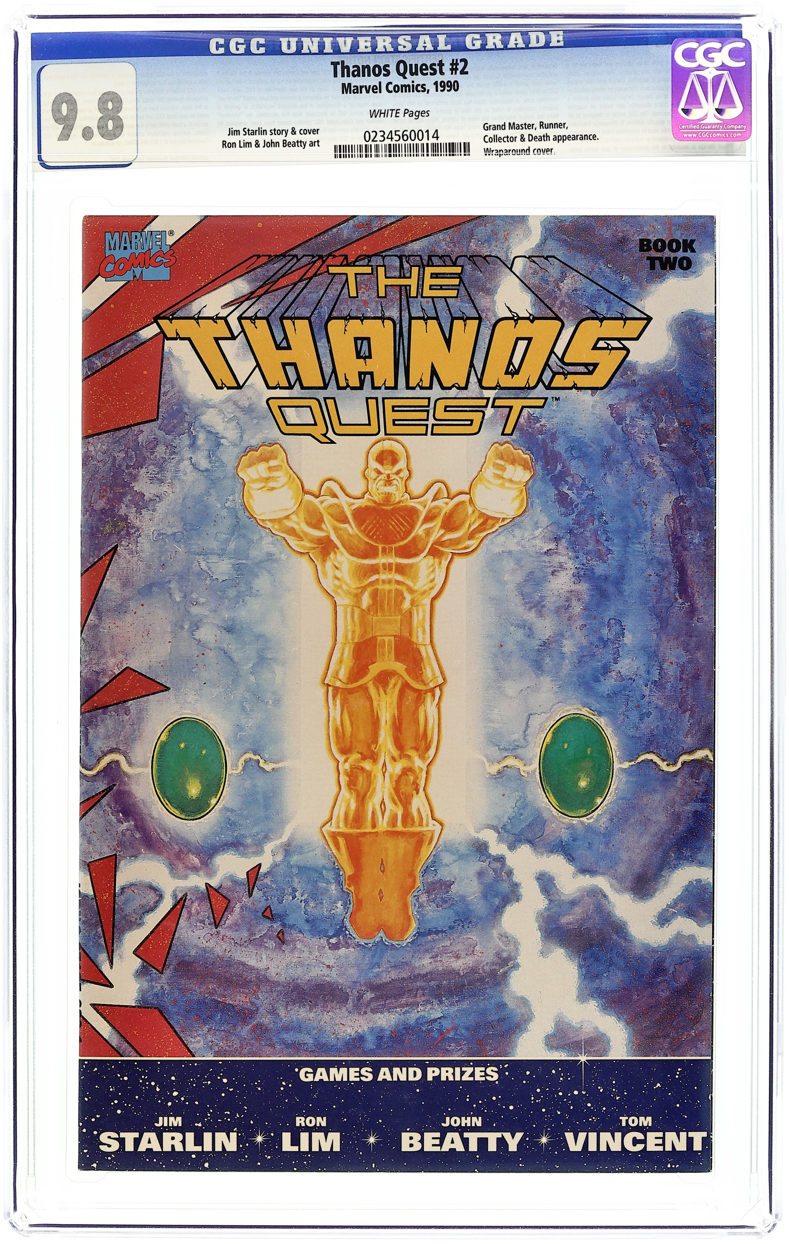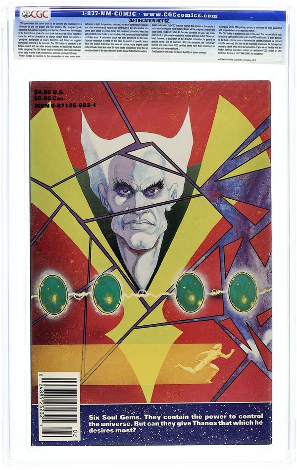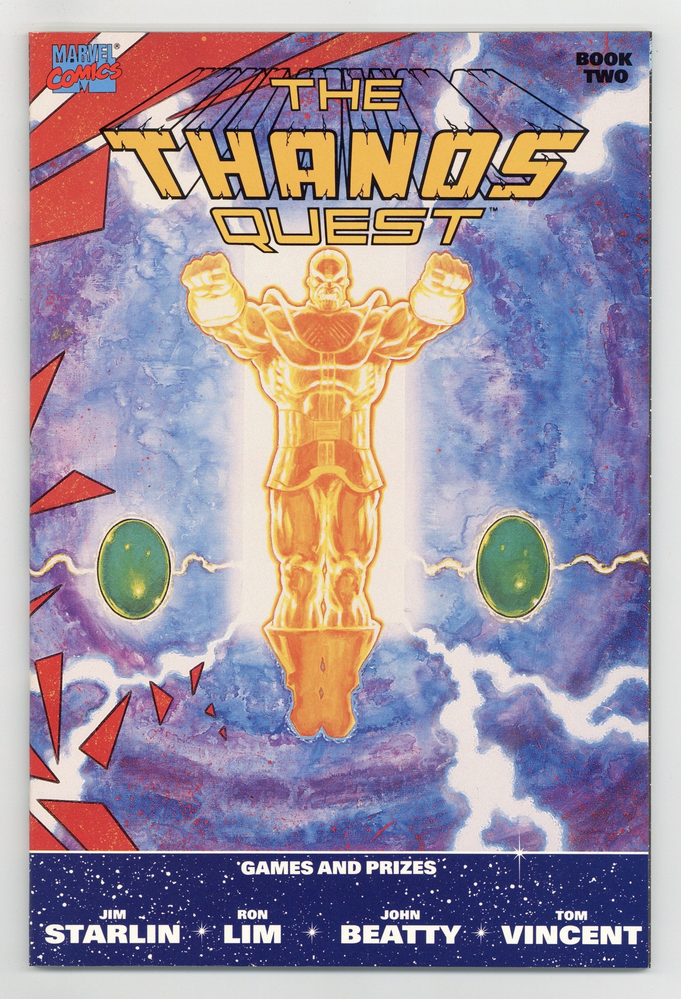 1st Printing. "Games and Prizes!" Written by Jim Starlin. Art by Ron Lim John Beatty. In order to obtain ultimate power, the Mad Titan will challenge the Elders of the Universe for this prize. Six Soul Gems. They contain the power to control the universe. But can they give Thanos that which he desires most? Featuring the Elders of the Universe the Runner, Collector and the Grandmaster. NOTE: Story continues in Silver Surfer (1987 2nd Series) #44. 48 pages, FC. Cover price $4.95.