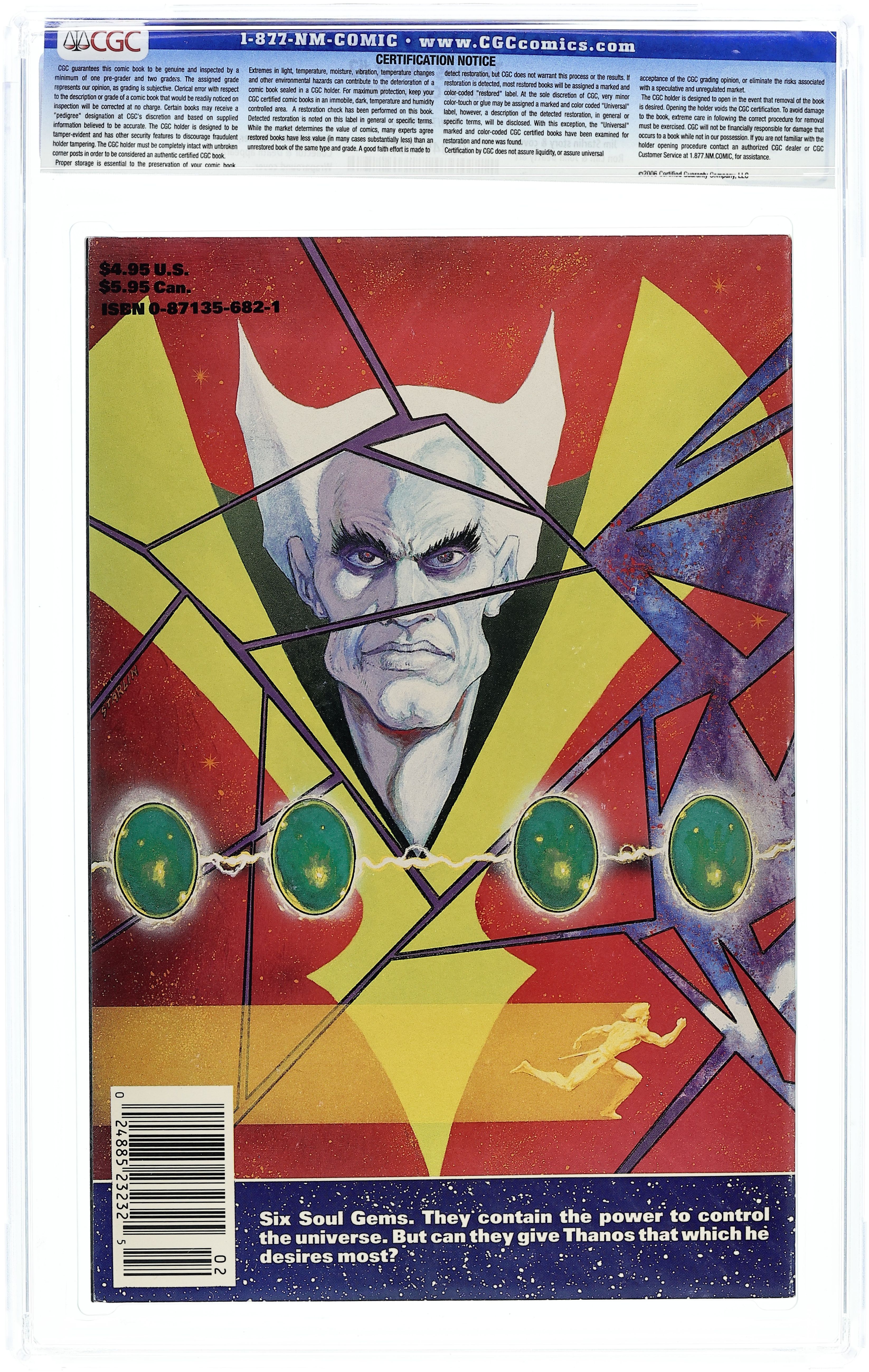 Tags: Infinity Gauntlet (part 0.06)$21.001st Printing. "Games and Prizes!" Written by Jim Starlin. Art by Ron Lim John Beatty. In order to obtain ultimate power, the Mad Titan will challenge the Elders of the Universe for this prize. Six Soul Gems. They contain the power to control the universe. But can they give Thanos that which he desires most? Featuring the Elders of the Universe the Runner, Collector and the Grandmaster. NOTE: Story continues in Silver Surfer (1987 2nd Series) #44. 48 pages, FC. Cover price $4.95.