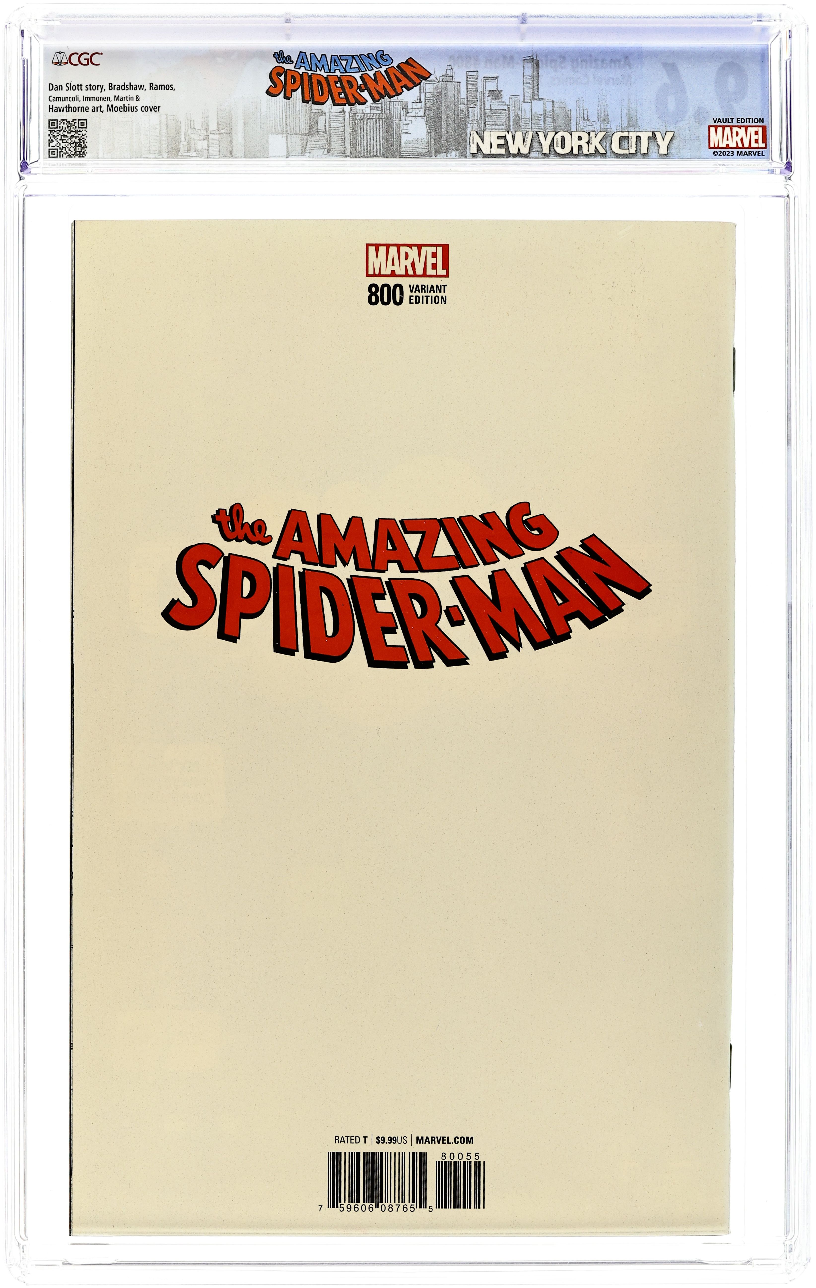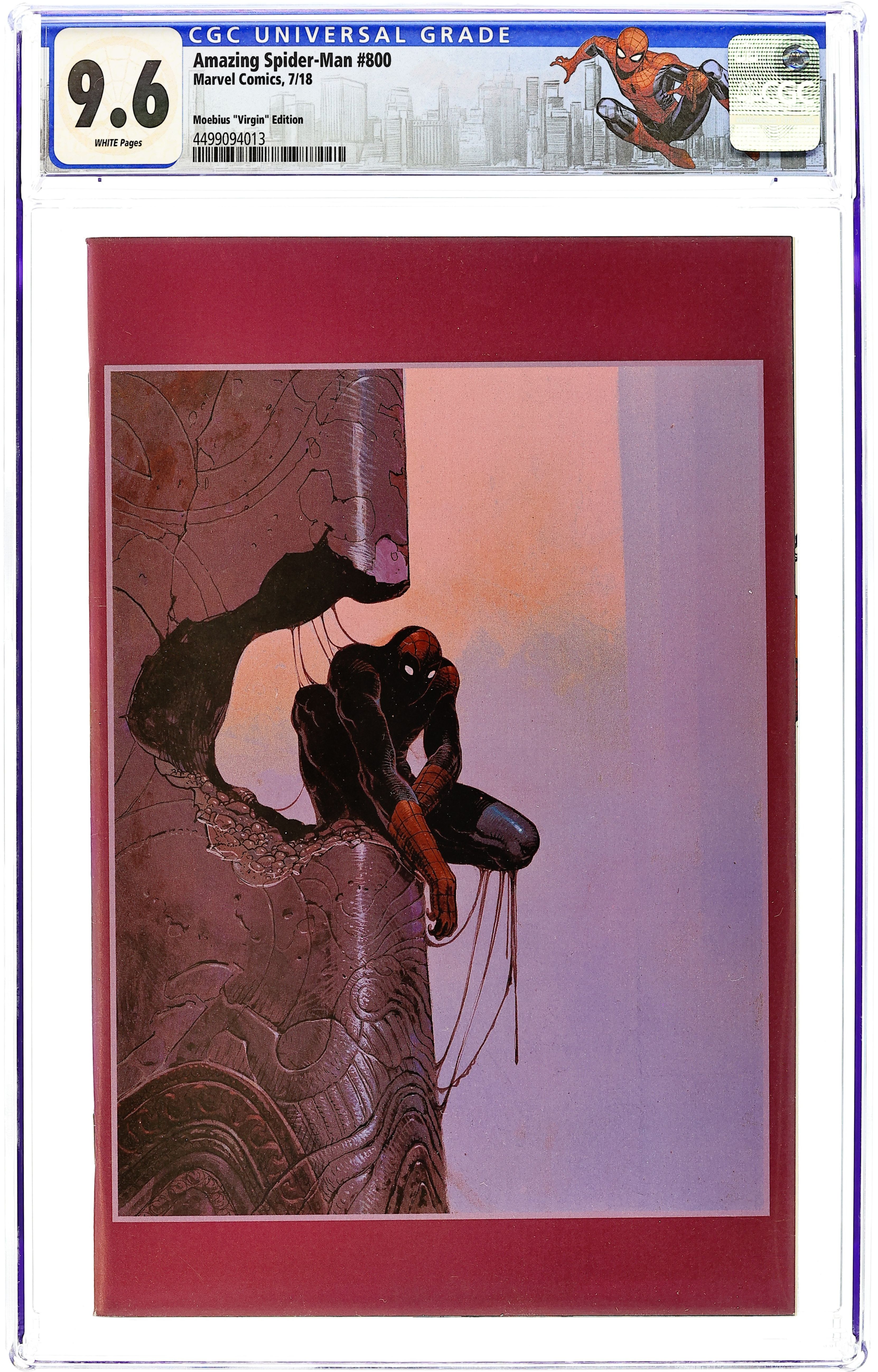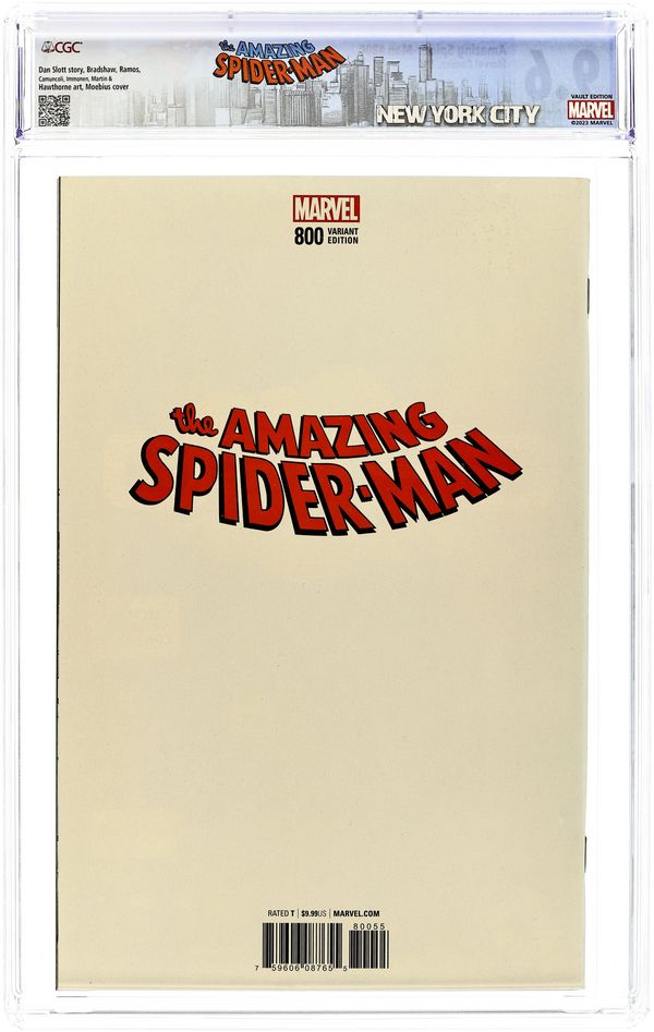 Limited 1 for 100 Retailer Incentive Variant Cover. Go Down Swinging: Part 4 of 4 - Written by Dan Slott. Art by Nick Bradshaw, Humberto Ramos, Guiseppe Camuconli, Stuart Immonen, Marcos Martin, Victor Olazaba, Cam Smith and Wade Von Grawbadger. Cover by Moebius. Dan Slott and Stuart Immomen are joined by many of the artists who made the last 10 years of Spider-Man so Amazing! The biggest Peter Parker/Norman Osborn story of all time unfolds over one 80-page story, a scope unmatched in comics! Who lives?! Who dies?! And what scars will Spider-Man bear from here on out?! 92 pages,full color. Rated T Cover price $9.99.
