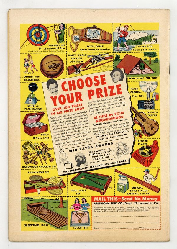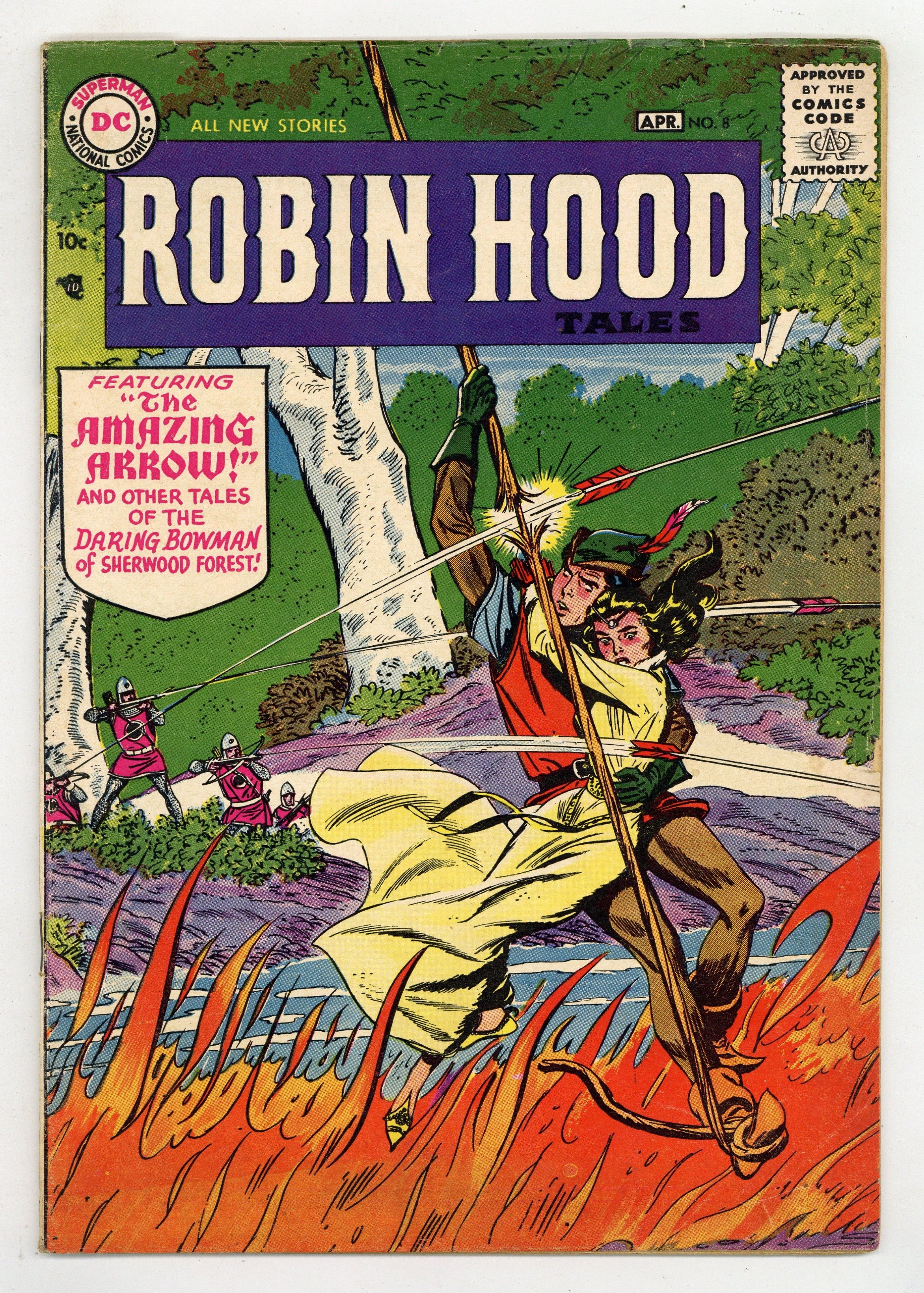 "The Amazing Arrow!" Having promised Prince John that he would only use one arrow to overcome three dilemmas (including a hostage situation), Robin cuts an arrow in half, effectively creating two arrows. Art and cover by Ross Andru and Mike Esposito. Cover price $0.10.