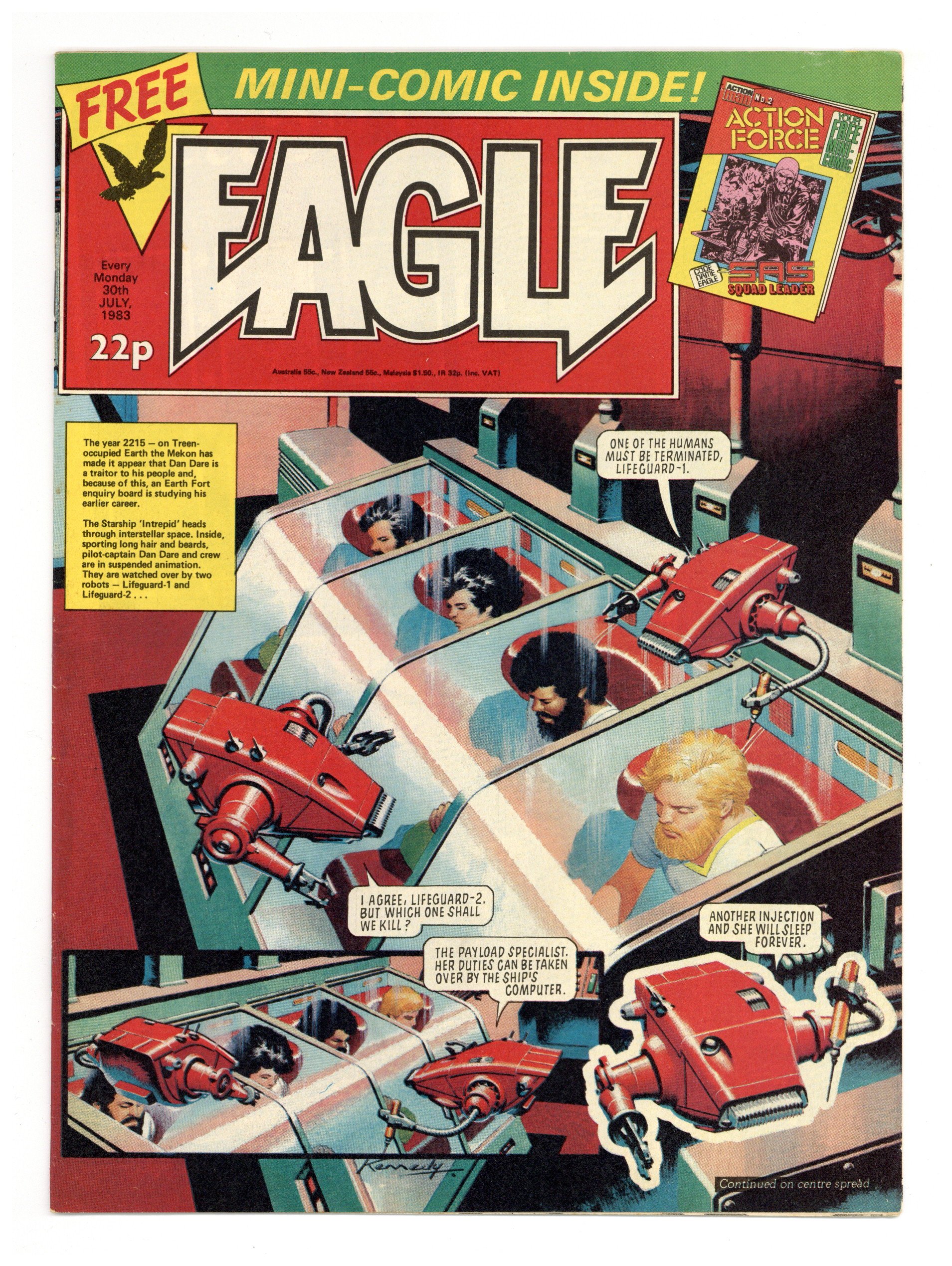 Issue #71 - July 30, 1983. Dan Dare by Pat Mills and Ian Kennedy, The Hand by Gerry Finlay and Vanyo, Crowe Street Comp by Fred Baker and Rex Archer, One-Eyed Jack. Plus fumetti and text articles. Includes Action Man #2 mini-comic. 8 1/2-in. x 11 1/2-in., 30 pages, B&W and color.