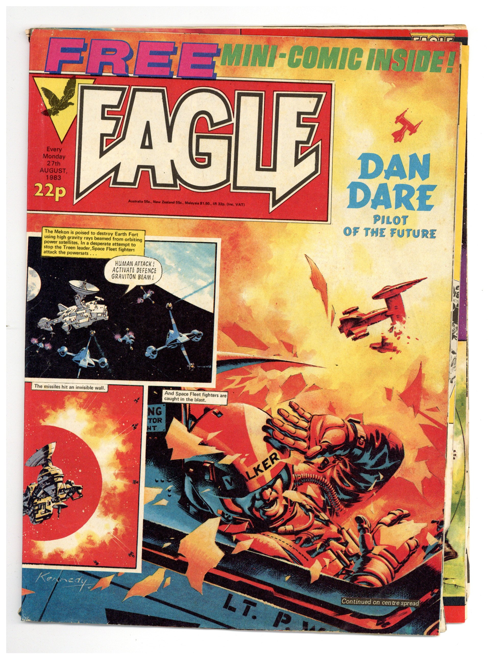 Issue #75 - Aug. 27, 1983. Dan Dare by Pat Mills and Ian Kennedy, The Hand by Gerry Finlay and Vanyo, Crowe Street Comp by Fred Baker and Rex Archer, One-Eyed Jack. Plus fumetti and text articles. Includes Action Force #4 mini-comic. 8 1/2-in. x 11 1/2-in., 30 pages, B&W and color.