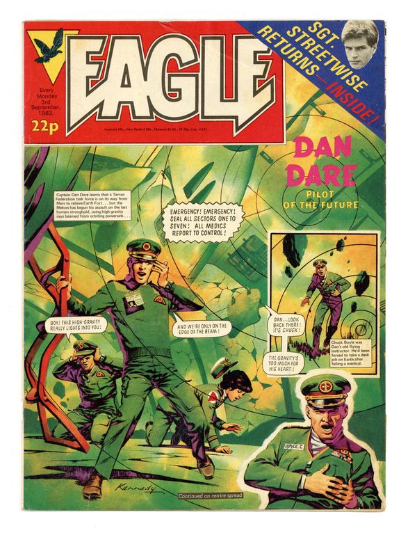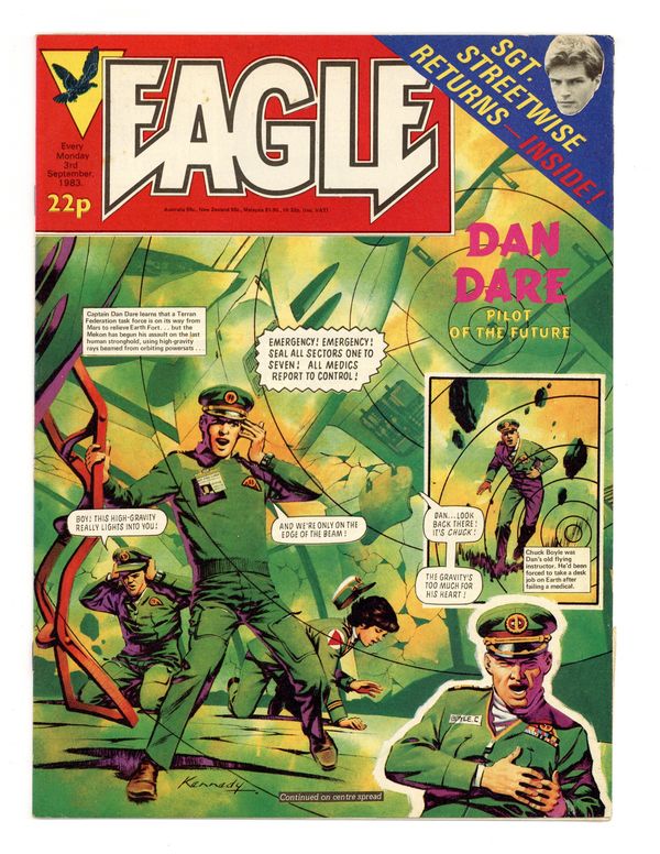 Published Sep 1983 by IPC Magazines.$7.20Issue #76 - Sept. 3, 1983. Dan Dare by Pat Mills and Ian Kennedy, The Hand by Gerry Finlay and Vanyo, Crowe Street Comp by Fred Baker and Rex Archer, One-Eyed Jack. Plus fumetti and text articles. 8 1/2-in. x 11 1/2-in., 30 pages, B&W and color.