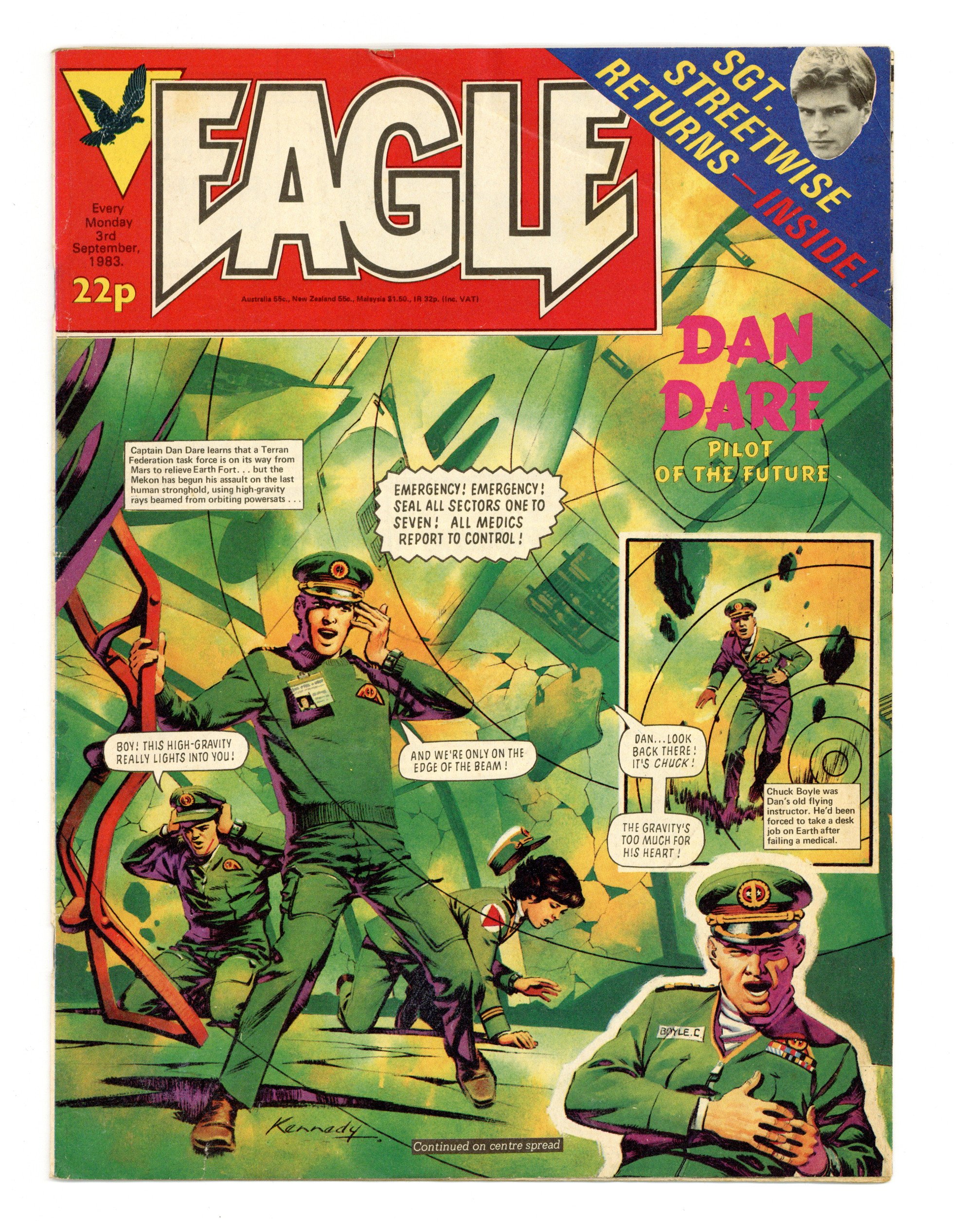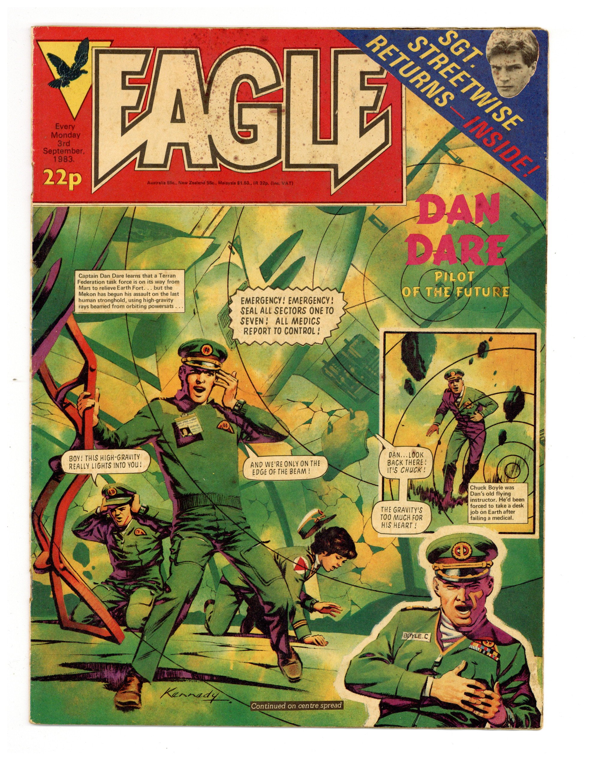 Issue #76 - Sept. 3, 1983. Dan Dare by Pat Mills and Ian Kennedy, The Hand by Gerry Finlay and Vanyo, Crowe Street Comp by Fred Baker and Rex Archer, One-Eyed Jack. Plus fumetti and text articles. 8 1/2-in. x 11 1/2-in., 30 pages, B&W and color.