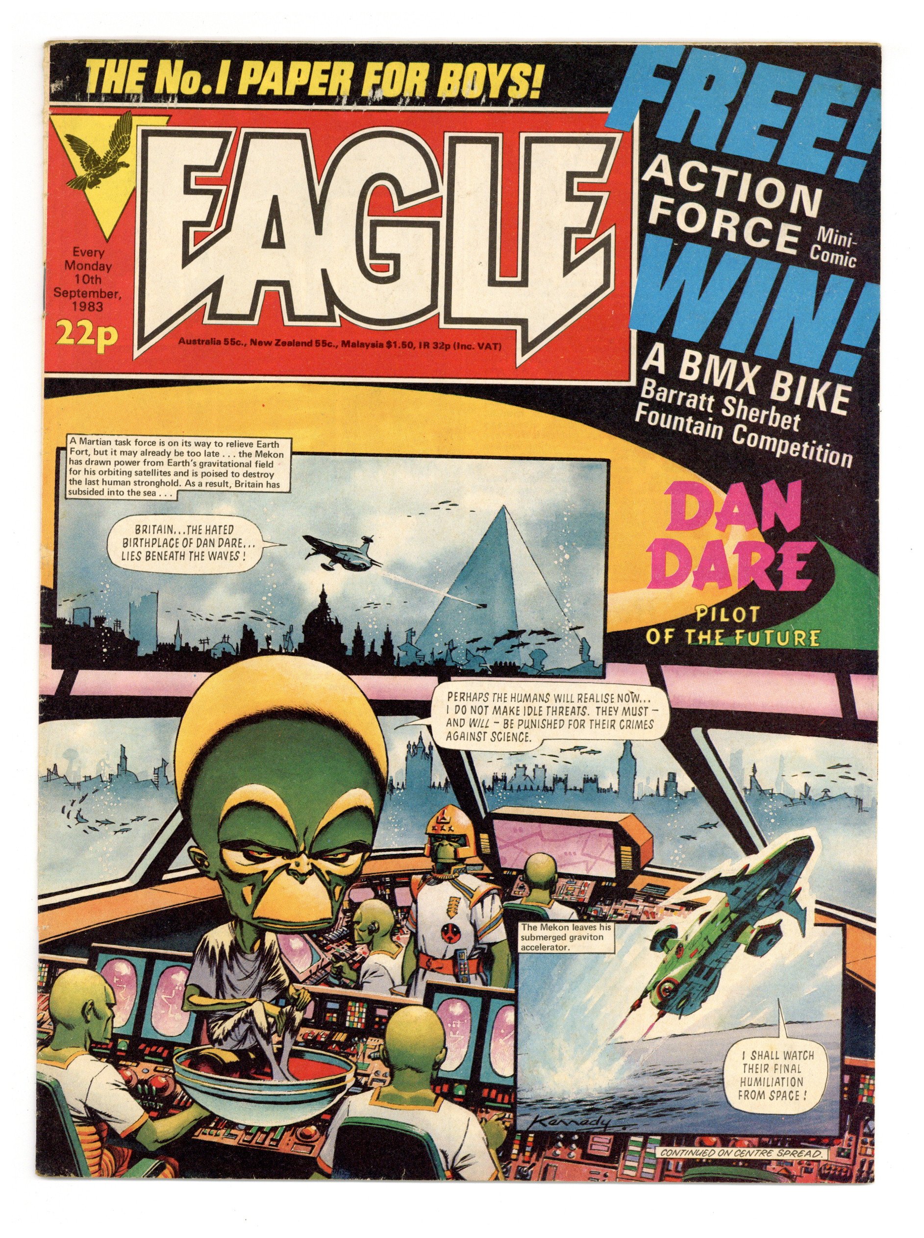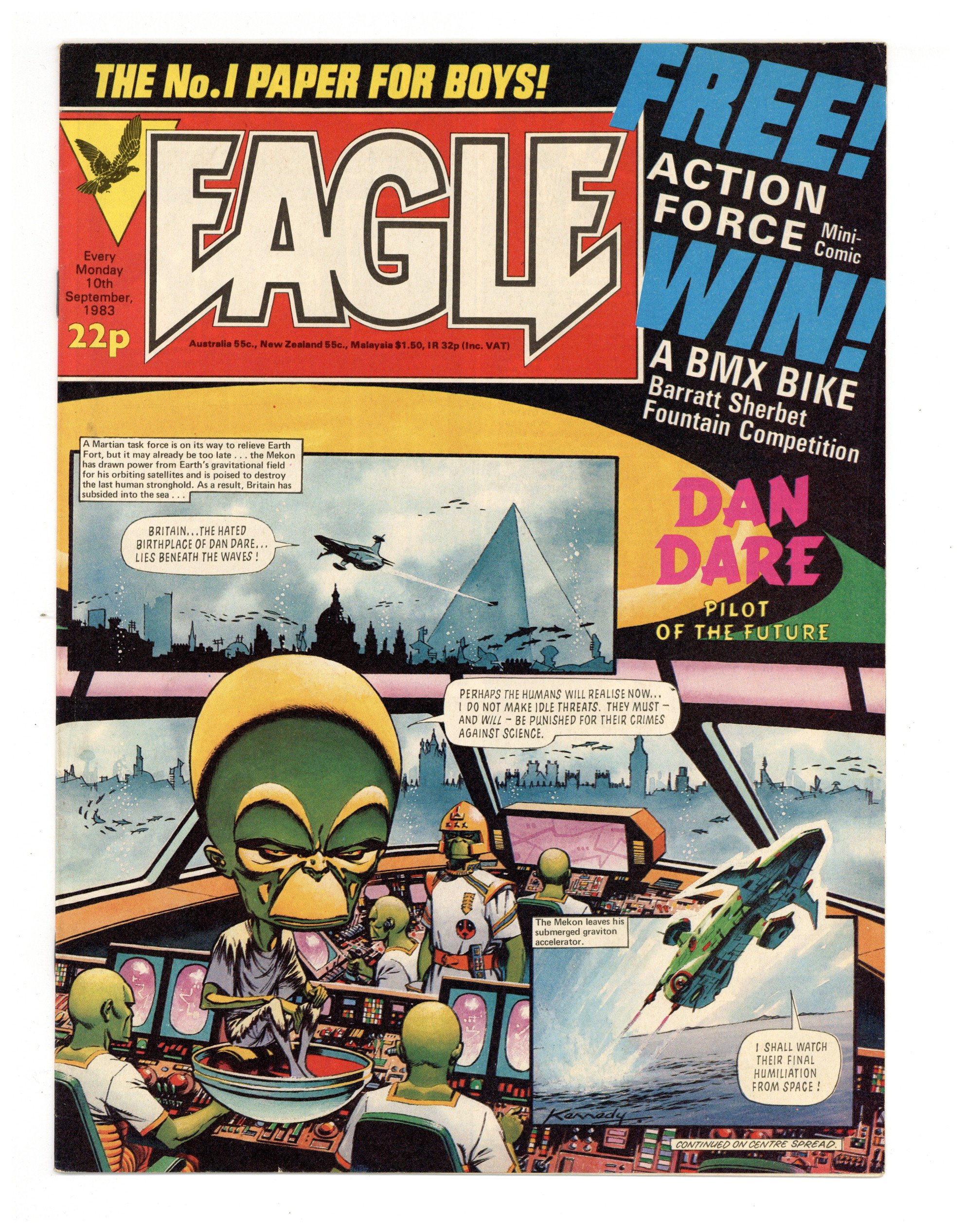 Issue #77 - Sept. 10, 1983. Features Dan Dare by Pat Mills and Ian Kennedy, The Hand by Gerry Finlay and Vanyo, Crowe Street Comp by Fred Baker and Rex Archer, One-Eyed Jack. Plus fumetti and text articles. 8 1/2-in. x 11 1/2-in., 30 pages, B&W and color.