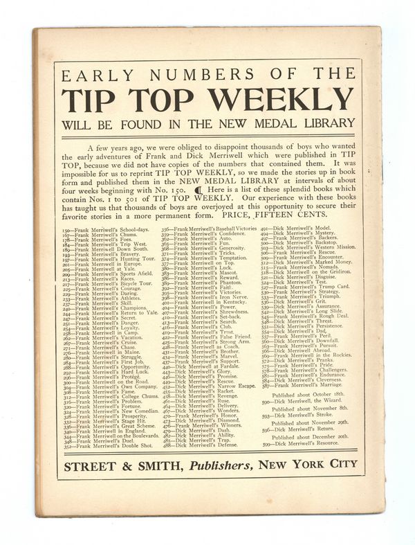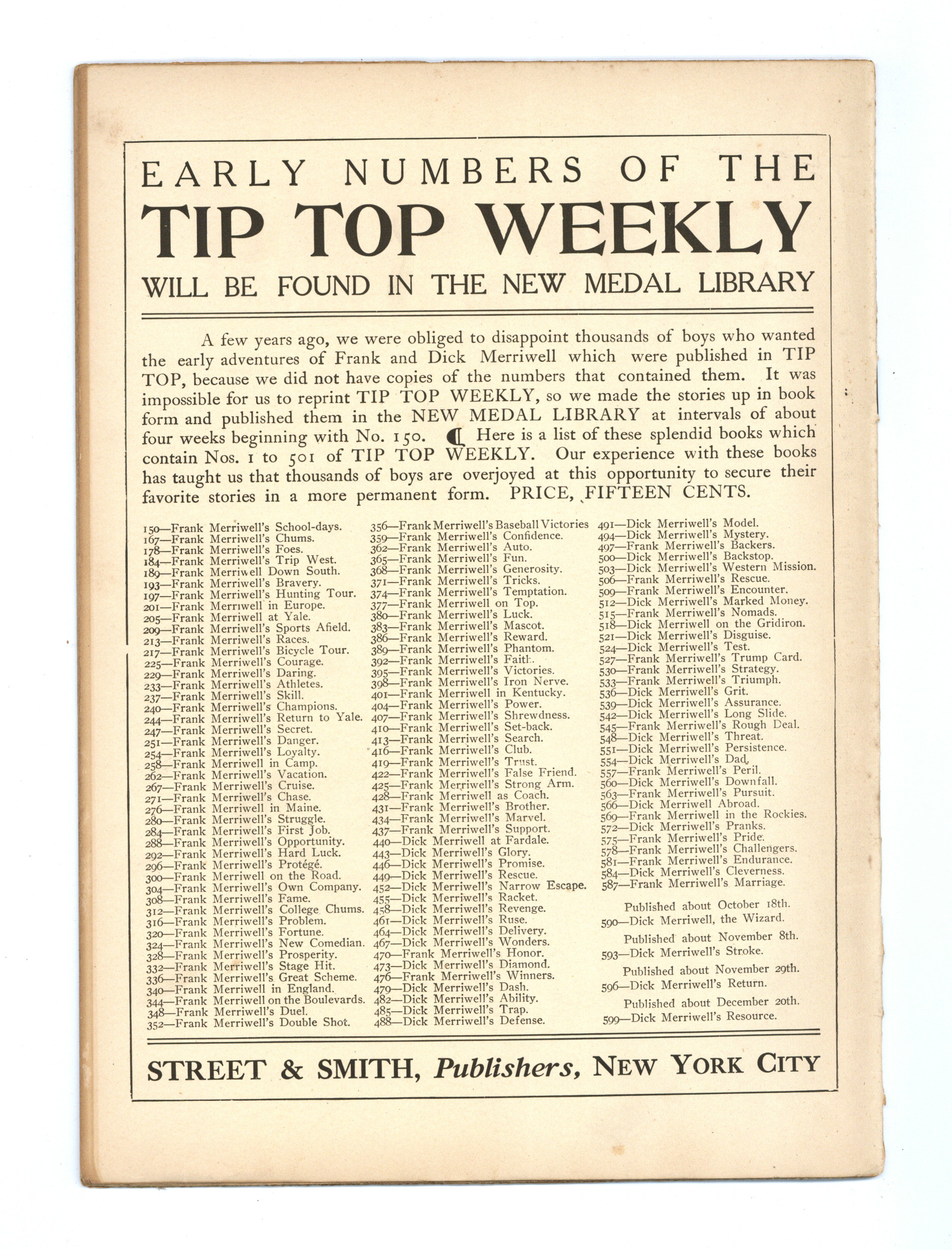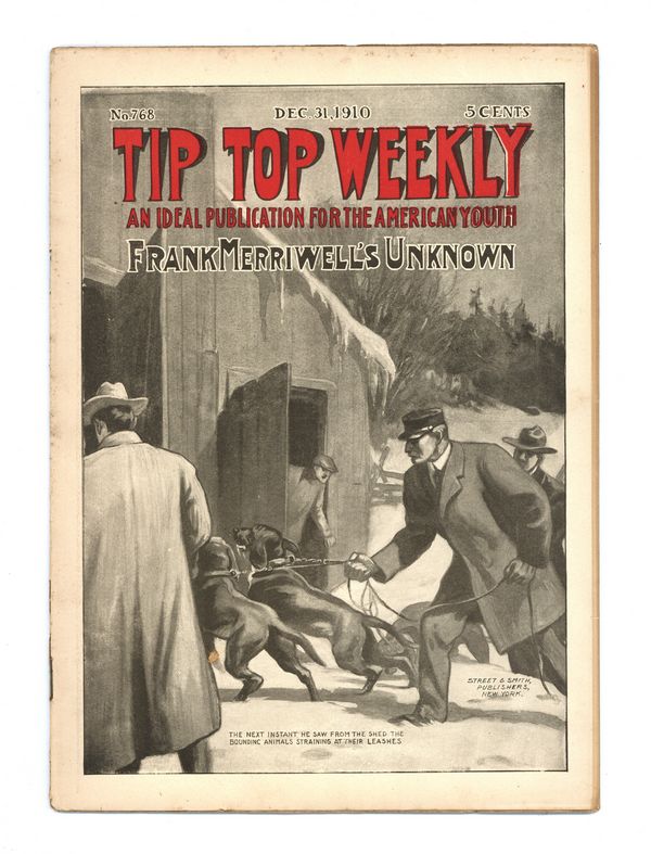 December 31, 1910. Written by Burt L. Standish (Gilbert Patten). Tip Top Weekly was promoted as "An Ideal Publication for American Youth," and was primarily devoted to the continuing adventures of student Frank Merriwell, who started at a fictional New England academy and then went to Yale, eventually becoming an international adventurer. Newsprint. 8.25-in. x 10.5-in. 34 pages, Text. Cover price $0.05.