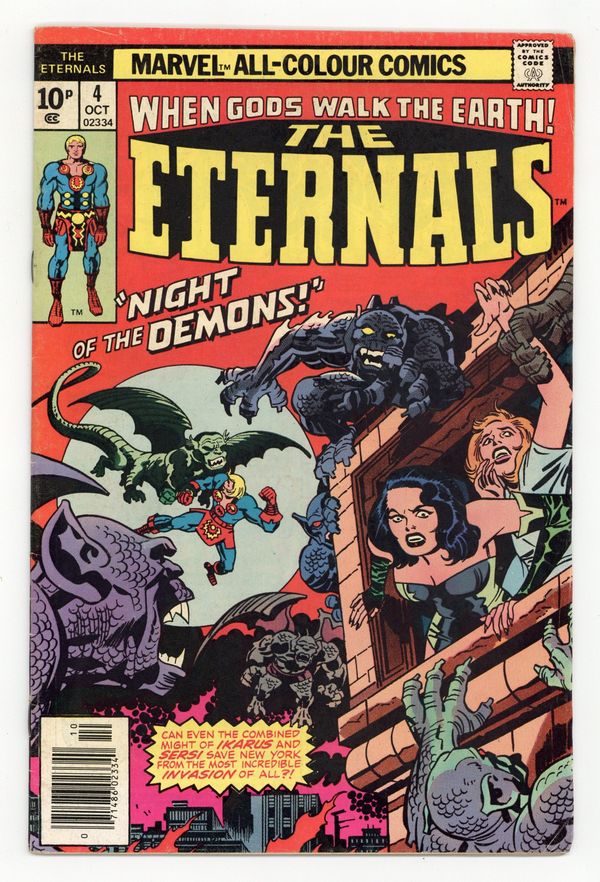 $16.00UK edition. Identical to US edition, but has 10p cover price. "The Night of the Demons!" Written by Jack Kirby. Pencils by Jack Kirby. Inks by John Verpoorten. Vampires, werewolves, devils and demons...! What if they were real? They are! The creatures and monsters of myth and legend are known as Deviants, a demonic race sworn to the destruction of the Eternals and their cousins, man. Can even the combined might of Ikaris and Sersi save New York City from the most incredible and monstrous invasion of all?