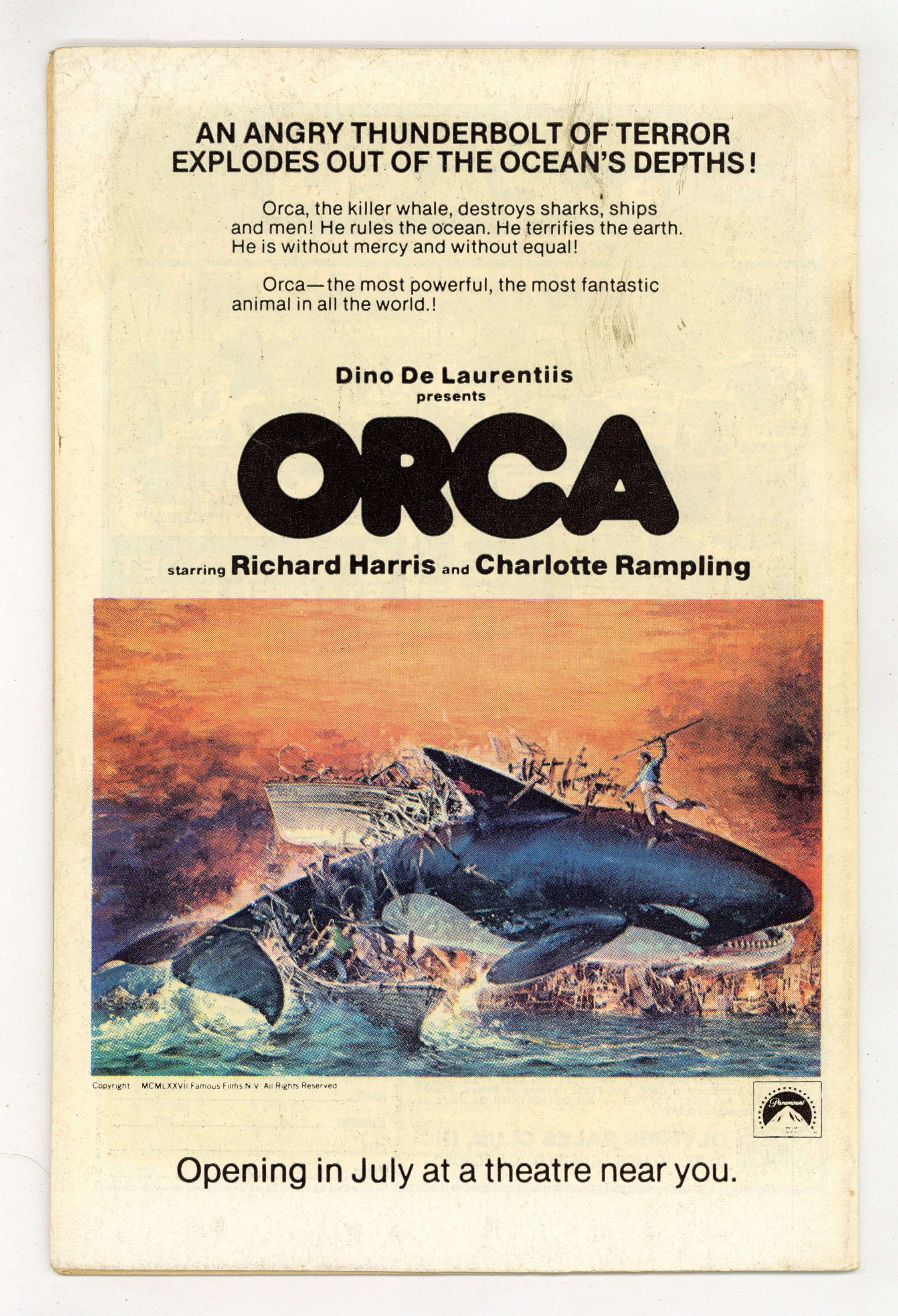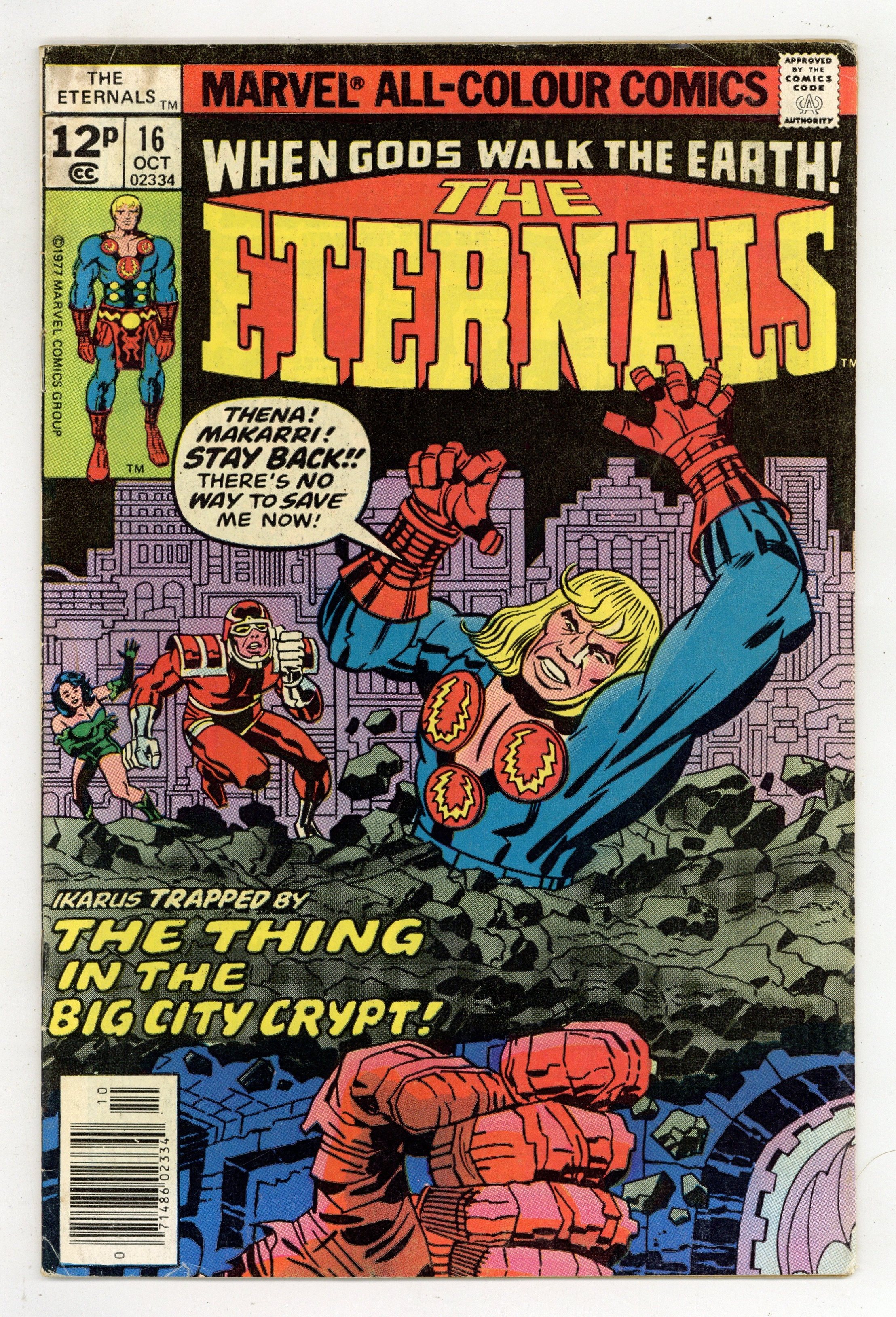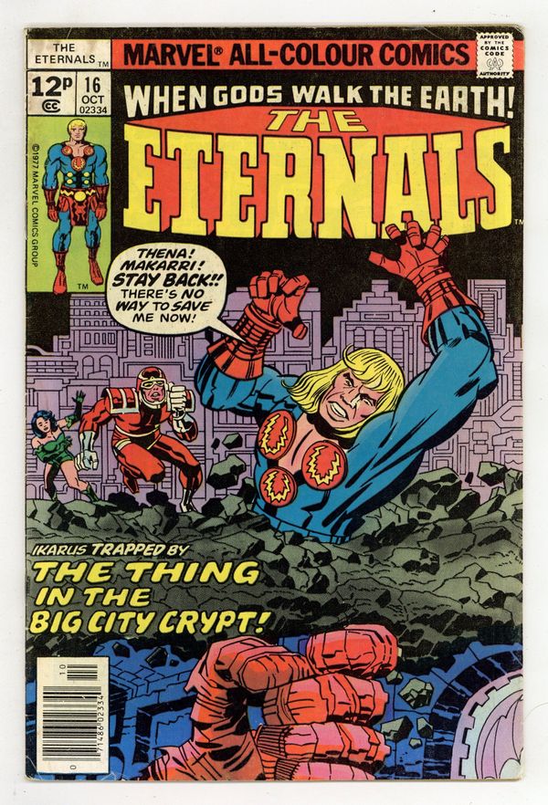 $45.00UK edition. Identical to US edition, but has 12p cover price. "Big City Crypt." Written by Jack Kirby. Pencils by Jack Kirby. Inks by Mike Royer. Zuras, immortal ruler of the Eternals, attempts to quell the rage of the Cosmic Hulk. However, the Eternals will soon learn that another far greater threat is about to arise...