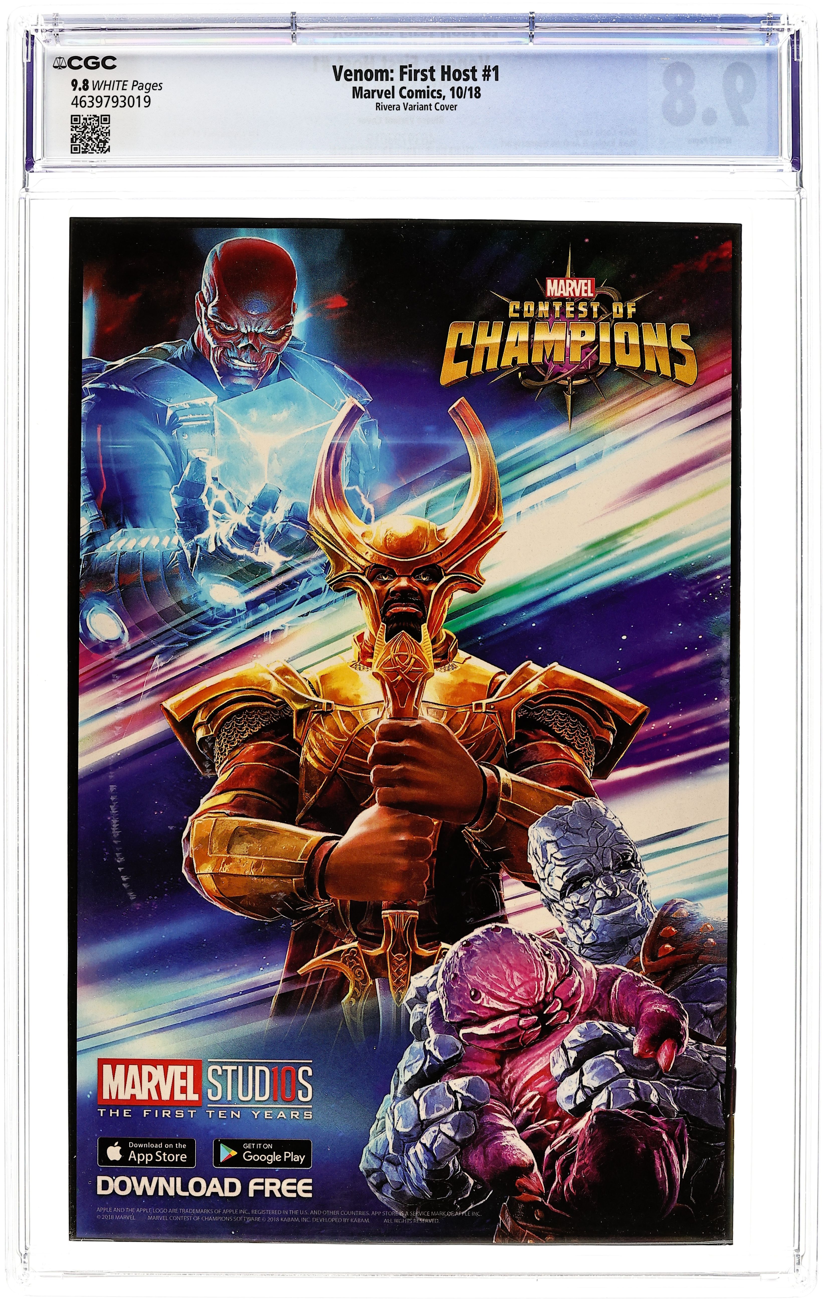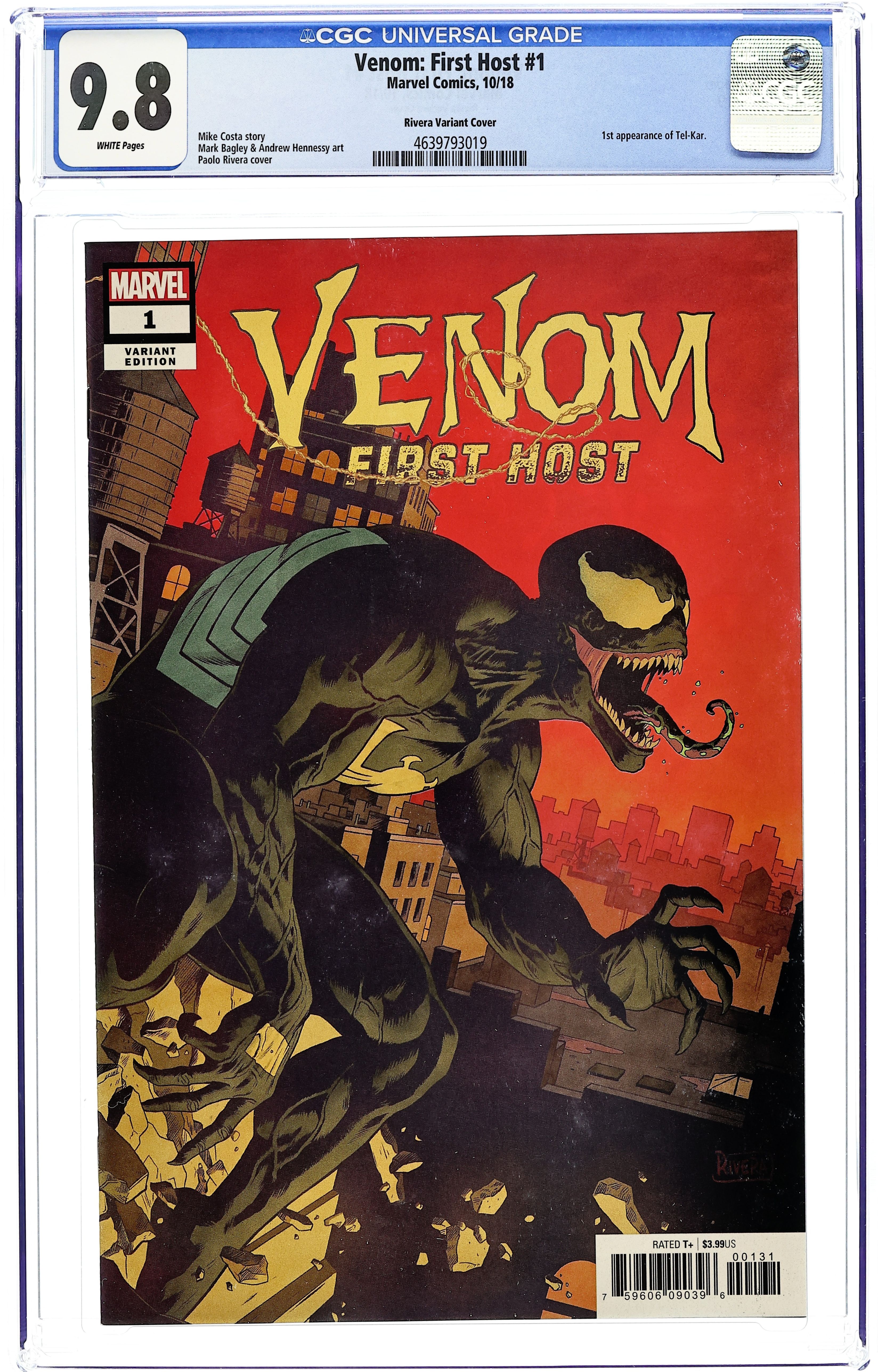 Written by Mike Costa. Art by Mark Bagley and Dono Sanchez-Almara. Cover by Paolo Rivera. MIKE COSTA AND MARK BAGLEY REUNITE FOR A VENOM STORY UNLIKE ANY OTHER! Before the AMAZING SPIDER-MAN…before VENOM… There was the FIRST HOST. And that First Host has returned in need of Venom's help - only by reuniting can the two avert cosmic ruin! Can Eddie and the symbiote trust one another long enough to save the galaxy, or will the FIRST HOST prove to be Venom's undoing?! 28 pages, full color. Rated T+ Cover price $3.99.