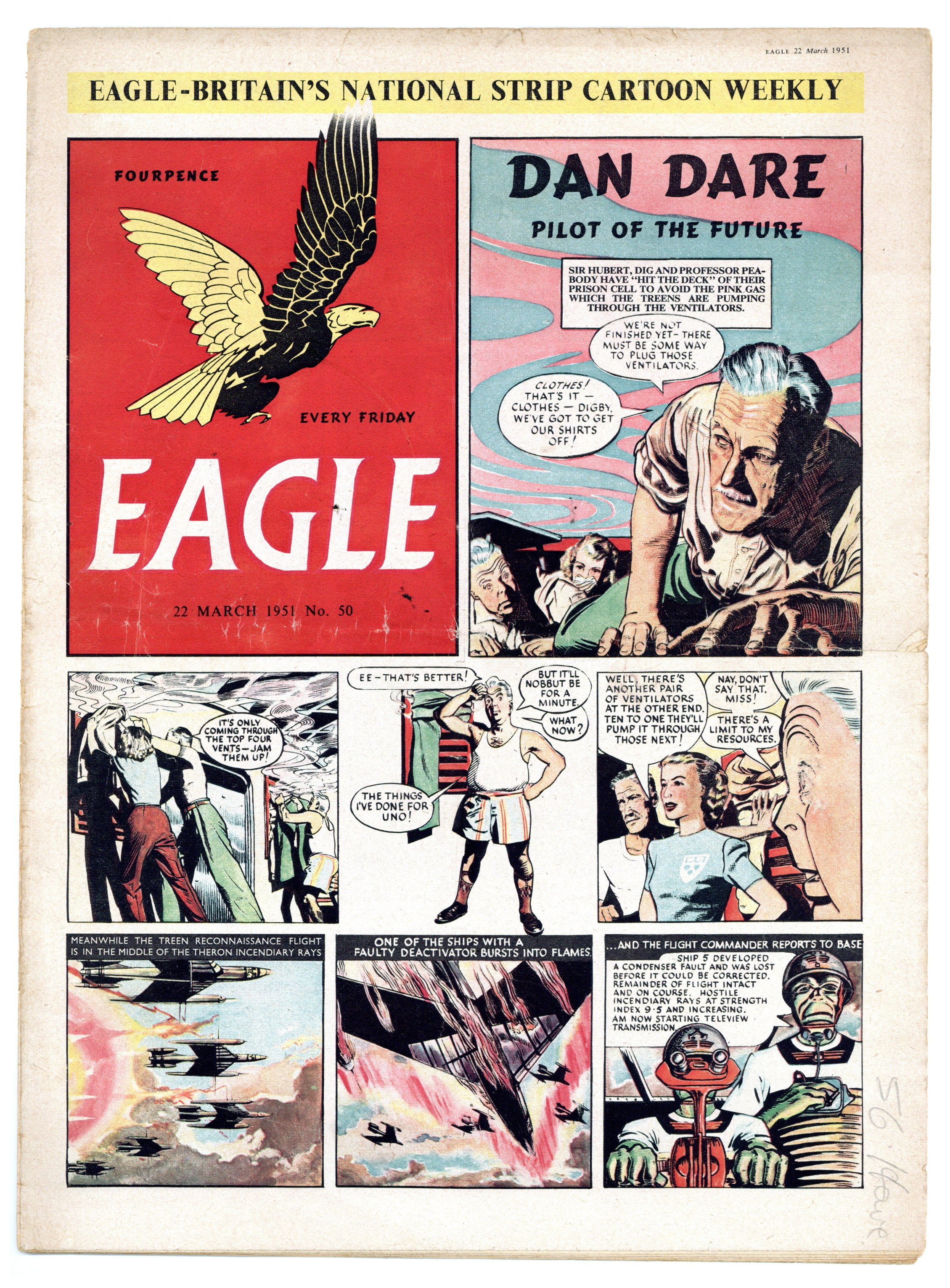 Vol. 1 #50 - Mar. 22, 1951. Contents include Dan Dare, P.C. 49, Riders on the Range, Eagle Cutaway centerfold, Skippy the Kangaroo, Harris Tweed Extra Special Agent, The Great Adventurer. Plus text stories and articles. 10 1/2-in. x 14 1/2-in., 16 pages, B&W and full color.