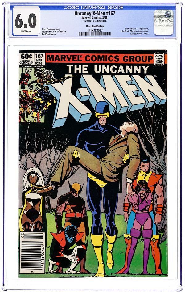 Lakeside Tattooz Insert Variant, NOTE: Some Tattooz inserts were produced without a temporary tattoo included. This listing is for copies of the comic that have an UNOPENED insert, but we cannot guarantee that the insert will have a tattoo inside. "The Goldilocks Syndrome! (or: Who's Been Sleeping in My Head?)" Part 6 of 6. Guest-starring the Fantastic Four, Starjammers, and the New Mutants. Story by Chris Claremont. Art by Paul Smith and Bob Wiacek. The X-Men return home to Xavier's Institute to find they've been replaced. But their skirmish with the New Mutants is the least of their concerns. Charles Xavier has been impregnated with a Brood Queen. In order to save mankind, the X-Men may be forced to take the life of their beloved mentor. Plus, the Shi'ar Majestrix Lilandra visits a warning on Reed Richards for the crime of saving the life of Galactus (see Fantastic Four #). 36 pgs. Cover price $0.60.