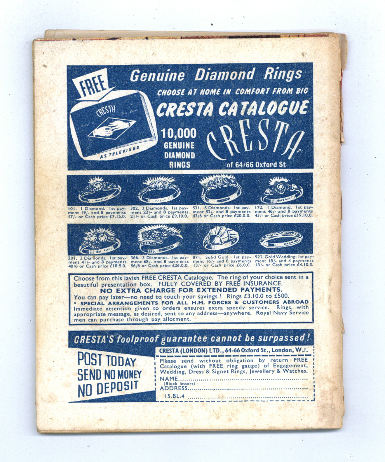 Published 1967 (est.) by IPC/Fleetway.$3.00- foxing back interior creases front/back spine break Front cover detached 70%. Water damage: Slight. Staple rust: Slight.