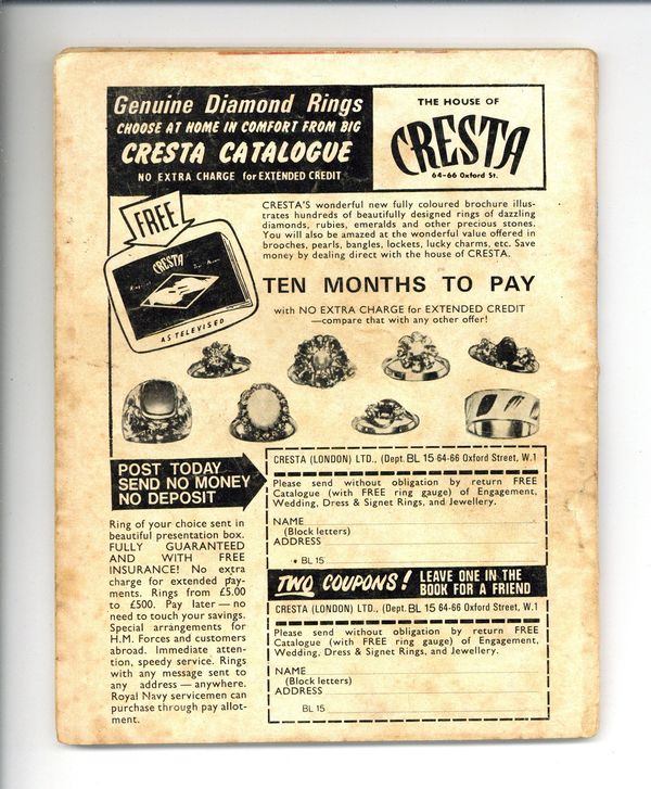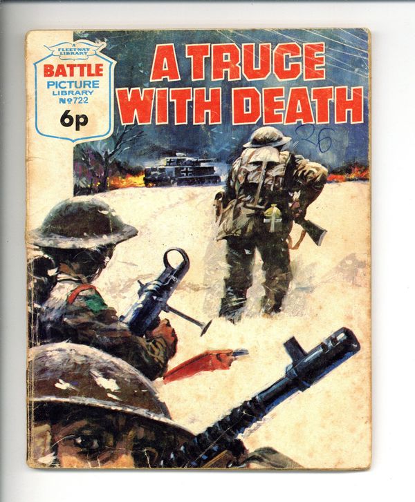 Published 1974 (est.) by IPC/Fleetway.$2.65Issue #722 - 1973. "A Truce With Death" originally appeared in Battle Picture Library #78 with a different cover. Story and art credits are unknown. A German and a British soldier must work together to survive in the mountainous terrain of Norway in 1940. 5 1/4-in. x 6 3/4-in., 66 pages, black and white.