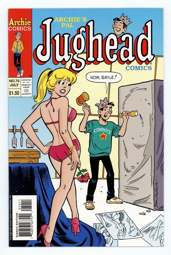 Tags: ArchiePublished Jul 1995 by Archie Publications.$25.00Cover art by Dan DeCarlo. "Gym Dandy," script by Bill Golliher, pencils by Stan Goldberg, inks by Mike Esposito; Jughead's parents force him to use a gift gym membership. "Paint Me Red," script by Joe Edwards, pencils by Stan Goldberg, inks by Mike Esposito; Chuck and Jughead travel into the deep woods to paint landscapes. "Hot Dog on a Roll of Film," script by Hal Smith, pencils by Stan Goldberg, inks by Mike Esposito; Jughead tries to take a funny picture of Hot Dog to enter into a photo contest. "The Eyes Have It" one-page story, script by Joe Edwards, pencils by Stan Goldberg, inks by Mike Esposito; Jughead gets more food than he can finish in the cafeteria. "Hats Off," script by Hal Smith, pencils by Stan Goldberg, inks by Mike Esposito; Riverdale is swamped by a groundswell of protest when the school board rules that Jughead can't wear his crown hat to school. 36 pgs., full color. Cover price $1.50.