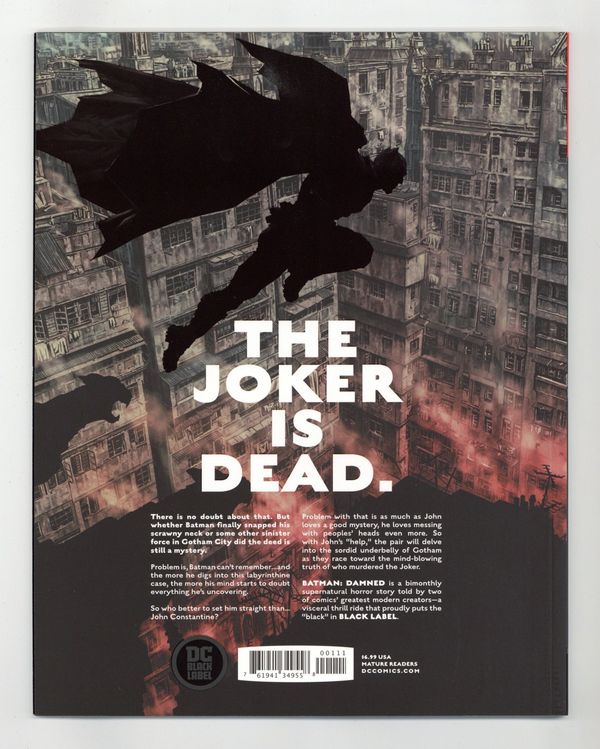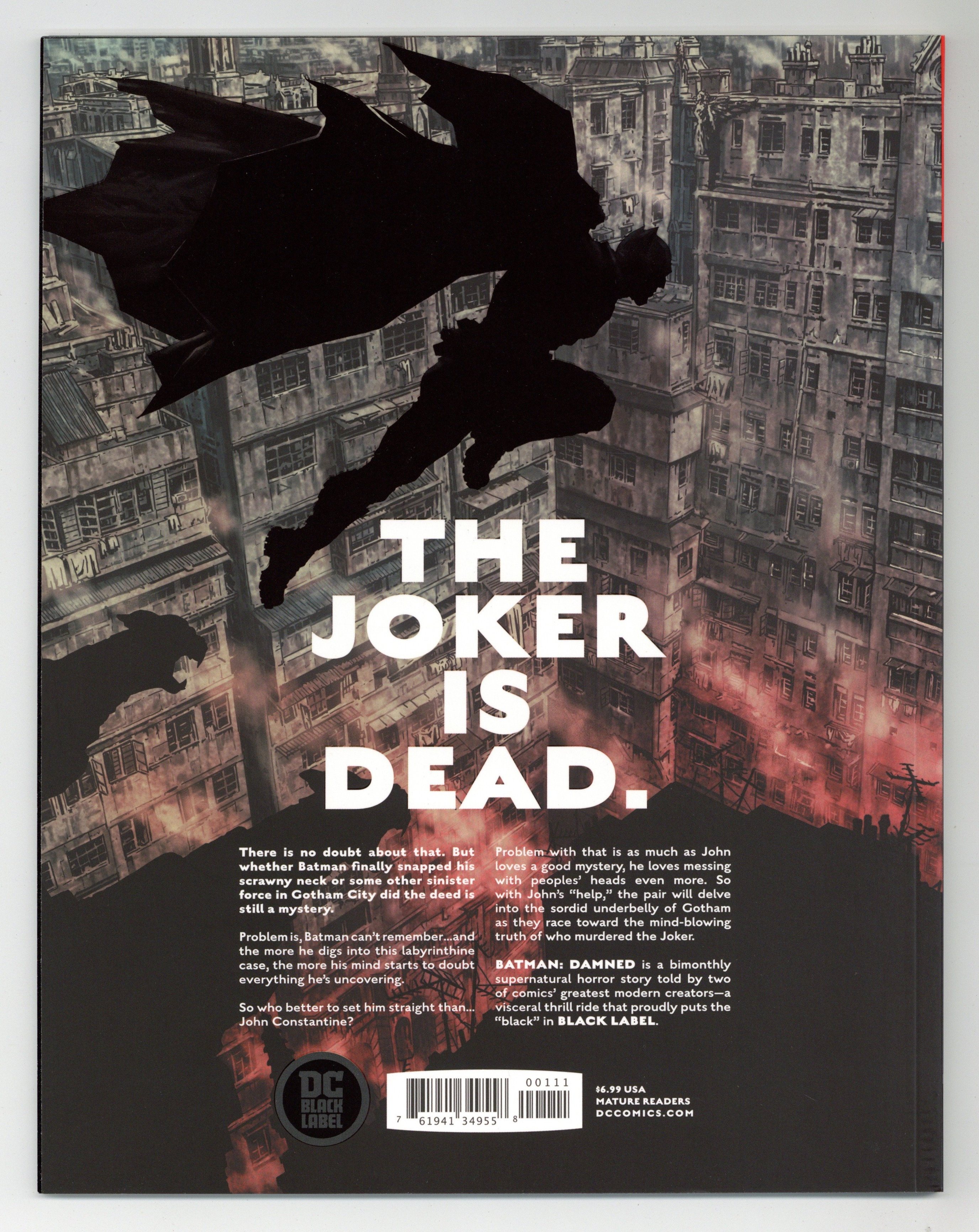 Starts Jan 19 Written by Brian Azzarello. Art and Cover by Lee Bermejo. DC BLACK LABEL, the highly anticipated new imprint from DC Comics, starts here! The Joker is dead. There is no doubt about that. But whether Batman finally snapped his scrawny neck or some other sinister force in Gotham City did the deed is still a mystery. Problem is, Batman can't remember… and the more he digs into this labyrinthine case, the more his mind starts to doubt everything he's uncovering. So who better to set him straight than… John Constantine? Problem with that is as much as John loves a good mystery, he loves messing with people's heads even more. So with John's 'help,' the pair will delve into the sordid underbelly of Gotham as they race toward the mind-blowing truth of who murdered The Joker. BATMAN: DAMNED is a bimonthly super-natural horror story told by two of comics' greatest modern creators-a visceral thrill-ride that proudly puts the 'black' in BLACK LABEL. 48 pages, full color. Mature Readers Cover price $6.99.
