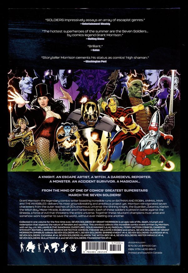 1st Edition - 1st printing. Collects Seven Soldiers (2005) #0-1, Seven Soldiers of Victory: The Shining Knight (2005) #1-4, The Guardian (2005) #1-4, Zatanna (2005) #1-4, Klarion the Witch Boy (2005) #1-4, Mister Miracle (2005) #1-4, The Bulleteer (2005) #1-4 and Frankenstein (2005) #1-4.