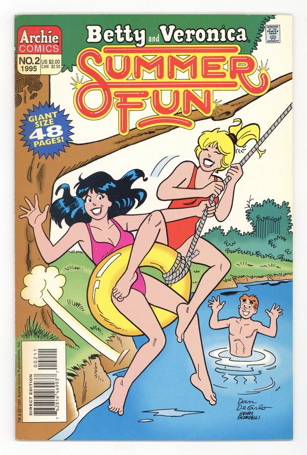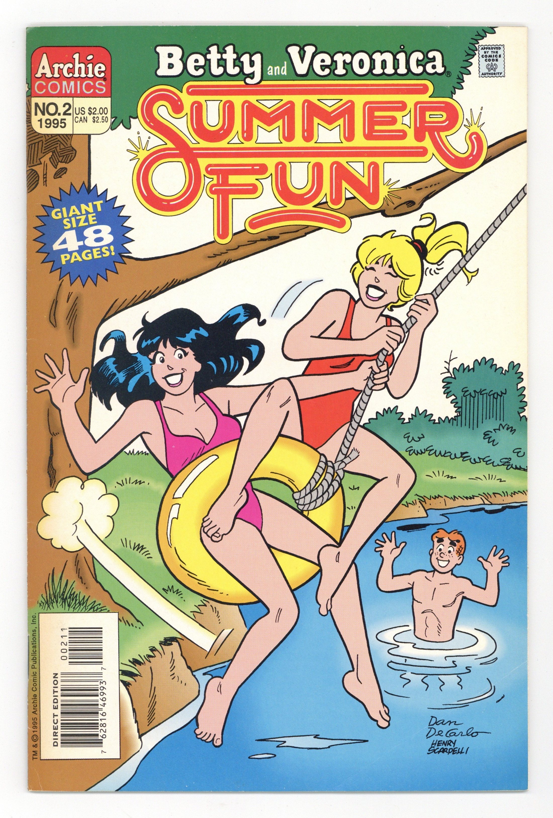 Tags: ArchiePublished Jun 1995 by Archie Publications.$9.00Cover pencils by Dan Parent, inks by Henry Scarpelli. "Muscle Bound," script by Frank Doyle, art by Dan DeCarlo; Two body builders humiliate Archie at the beach. United Cerebral Palsy Associations public service announcement with the Archie gang. "Runner Up," script by Frank Doyle, art by Dan DeCarlo; Betty goes running on a summer morning; Archie helps Betty cool off with a hose and accidentally does the same to Veronica. "Wet, Wild, and Wacky"; When Veronica thinks the Lodge pool water has recuperative properties she bottles it for sale. "Summer Blues"; Betty is uncharacteristically depressed during a summer day on the beach; Veronica and Archie decide to cheer up Betty by appointing her judge of the "Mr. Sandman" contest. "Surf 'n' Turf," script by Frank Doyle, pencils by Dan DeCarlo, inks by Henry Scarpelli; Betty and Veronica get back at the boys for knocking them over while skateboarding by building a king sized skate/surfboard. "Poor Fish!", script by Mike Pellowki, pencils by Dan DeCarlo, inks by Henry Scarpelli; Archie, Betty, and Veronica are camp counselors; When Archie snubs both Betty and Veronica and selects Jughead has his partner in a fishing derby the girls decide to create their own team, even though neither know how to fish. "Gorilla My Dreams," script by Mike Pellowki, pencils by Dan DeCarlo, inks by Henry Scarpelli. 48 pgs., full color. Cover price $2.00.